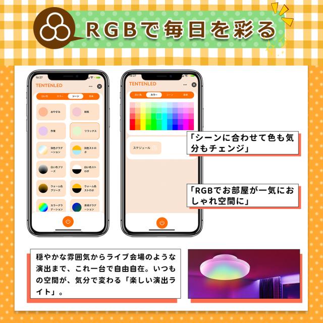 ★リモコンやスマホアプリを使って、ワンタッチでお好みの色を自由に選択可能。さらに、グラデーションや点滅、リズム連動など、多彩な演出モードも用意されており、シーンに応じて最適なライティングが実現できます。