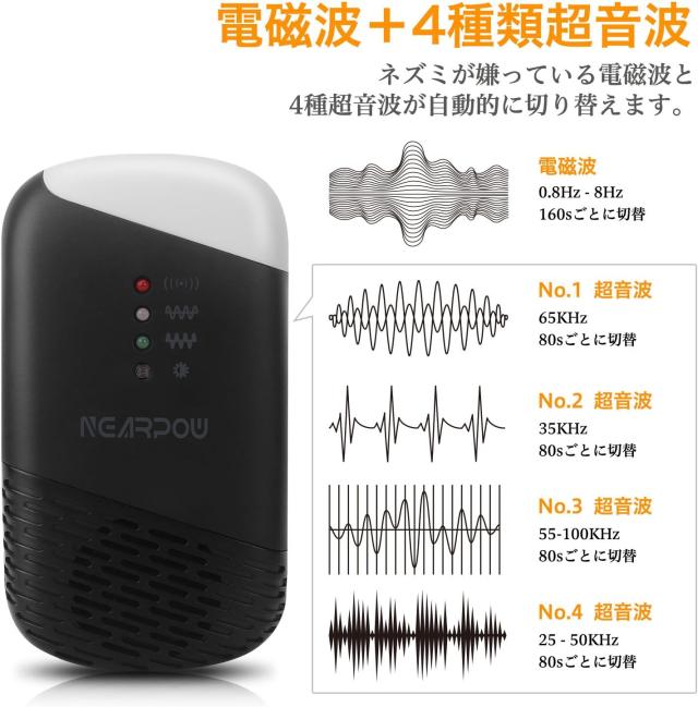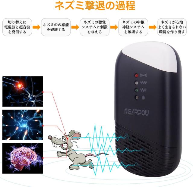従来の電磁波と2種類の超音波を発信するネズミ対策品と違って、弊社のネズミ撃退器が最新の電磁技術とを4種類超音波採用しており、嫌っている電磁波と超音波が自動的に切り替えして、ネズミが心地よく生きられない雰囲気を作り出すことによって、鼠の聴覚、嗅覚、神経を破壊して、生育機能に影響を与え、効果的に駆除できます。