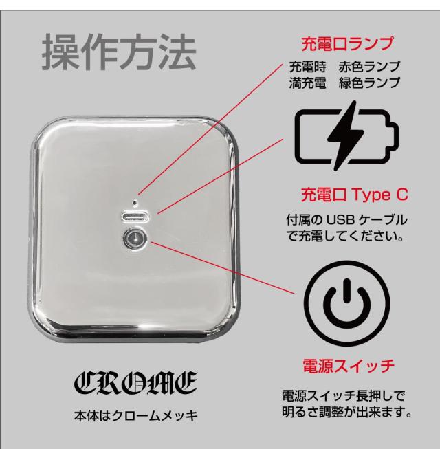 本体裏面にボタンがあります。 「ワンタッチ」: 電源の ON/OFF 「長押し」: 明るさを調節(無段階調光) |