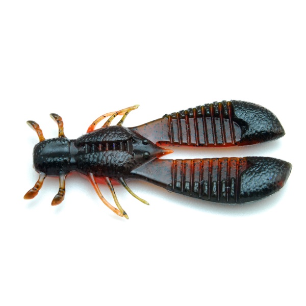 今までに類を見ないほど分厚く重い爪が生む強烈なパンチをしなやかで幅広いアームが逃さず受け止め団扇のごとく天地左右遠くまで水を弾き飛ばす。それにより生み出される強波動は従来のワームを遥かに超える集魚力を発揮。しかし、ただそれだけでは使いどころの限られた扱い難い物になってしまうため、軽いアクションでも敏感に動くサイドレッグ各種やアクションの余韻を生む浮力と甲殻類ライクな微波動を生む腹部の薄板リブなど随所にギミックパーツを盛り込む事でフォールやズル引き、スイミングやステイに至るまでいついかなる時もバスを誘い続け、緩急の効いたアクション変化でバイトトリガーにスイッチを入れるワームに仕上げています。