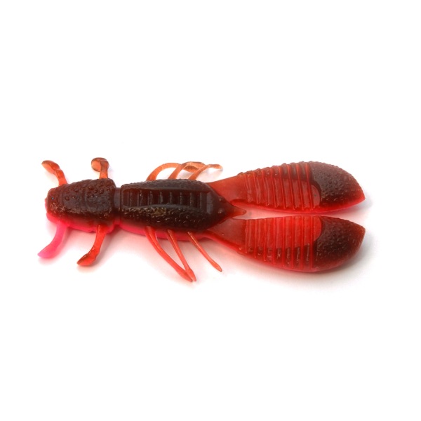 今までに類を見ないほど分厚く重い爪が生む強烈なパンチをしなやかで幅広いアームが逃さず受け止め団扇のごとく天地左右遠くまで水を弾き飛ばす。それにより生み出される強波動は従来のワームを遥かに超える集魚力を発揮。しかし、ただそれだけでは使いどころの限られた扱い難い物になってしまうため、軽いアクションでも敏感に動くサイドレッグ各種やアクションの余韻を生む浮力と甲殻類ライクな微波動を生む腹部の薄板リブなど随所にギミックパーツを盛り込む事でフォールやズル引き、スイミングやステイに至るまでいついかなる時もバスを誘い続け、緩急の効いたアクション変化でバイトトリガーにスイッチを入れるワームに仕上げています。