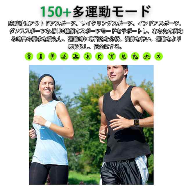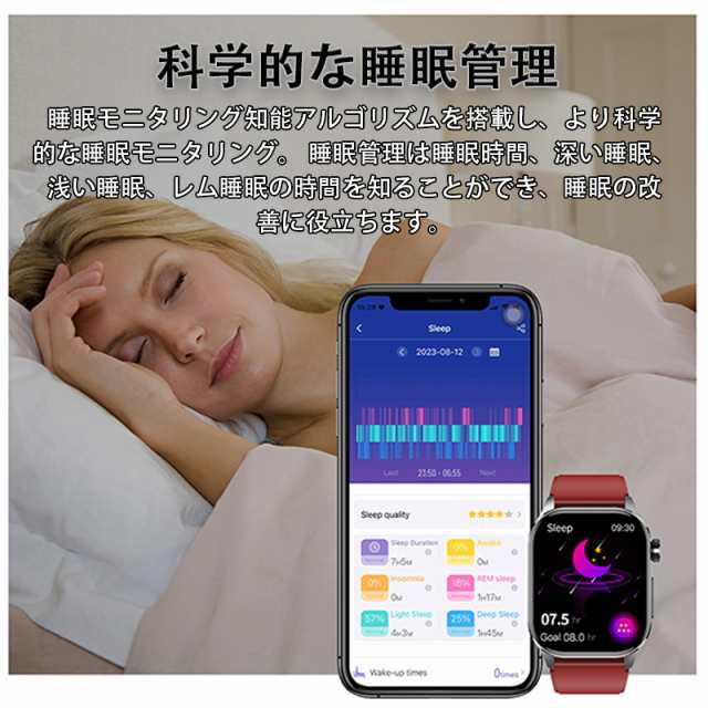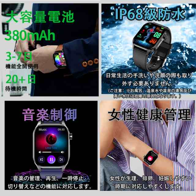 スマートウォッチの文字盤は固定ではありません。多くの文字盤から選べるだけではなく、お好みによって自分が好きな写真を文字盤に設定できます。 240* 280の高解像度と2.04インチのフルタッチスクリーンで、細かい文字でもはっきりと表示されます。他にも音楽コントロール、携帯を探す、腕上げ点灯、タイマー、ストップウォッチ、データ同期、女性生理管理など便利な機能を備えているので、男性でも女性でも使いやすいです!!生活、仕事の効率をさらに上げ、日常生活もより便利にしてくれます。