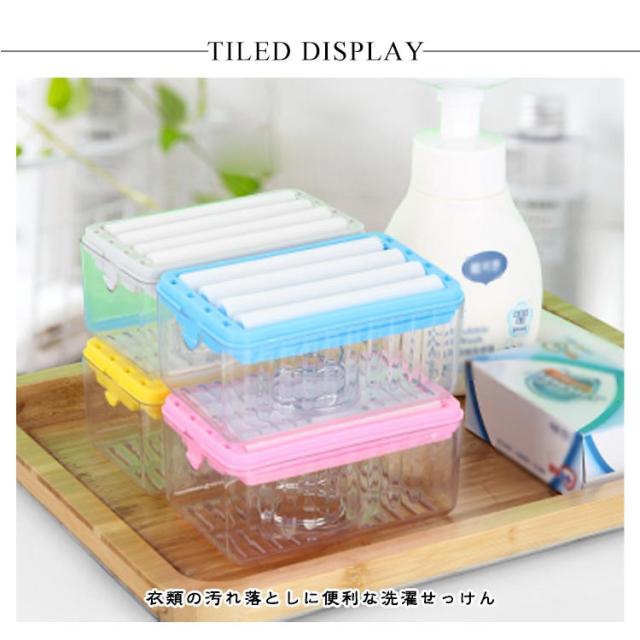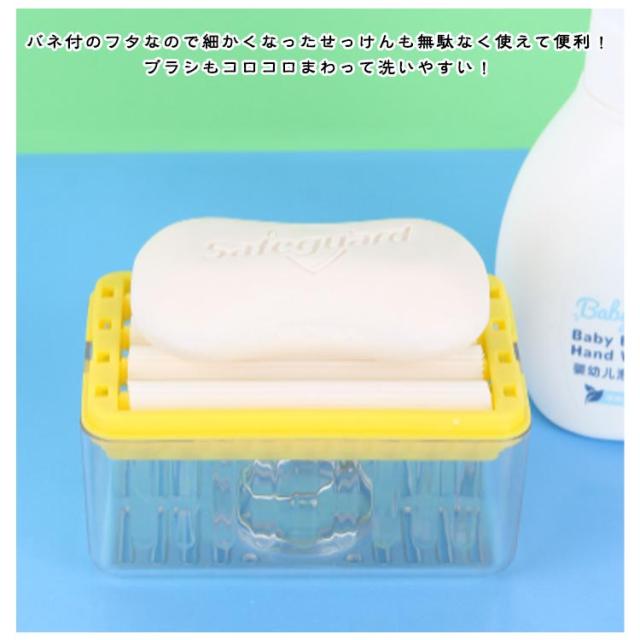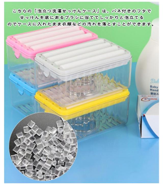| 衣類の汚れ落としに便利な洗濯せっけん。ただ、せっけんの置き場所やせっけんが乾きにくいなど、使いにくさを感じる方も多いのではないでしょうか?そんな方に!洗濯がもっと便利に、もっと楽しくなるアイテムが登場! こちらの「泡立つ洗濯せっけんケース」は、バネ付きのフタでせっけんを底にあるブラシに当ててしっかりと泡立てるのでケースに入れたまま衣類などの汚れを落とすことができます。バネ付のフタなので細かくなったせっけんも無駄なく使えて便利!ブラシもコロコロまわって洗いやすい!使った後も、フタに通気口があるから乾きやすく、洗濯中に置き場所に困っていたせっけんも、トレーに置けば濡れたまま置いても周囲を汚しません。 エリ、ソデ、子供服、上履き、くつ下、ユニホームなどの頑固な汚れに。 せっけんの収納から衣類の汚れ落としまでこれ1つでOK! | |