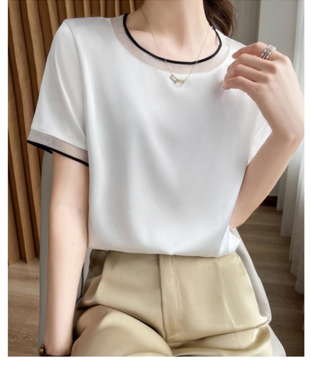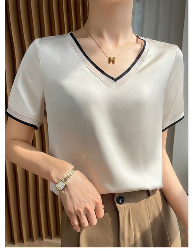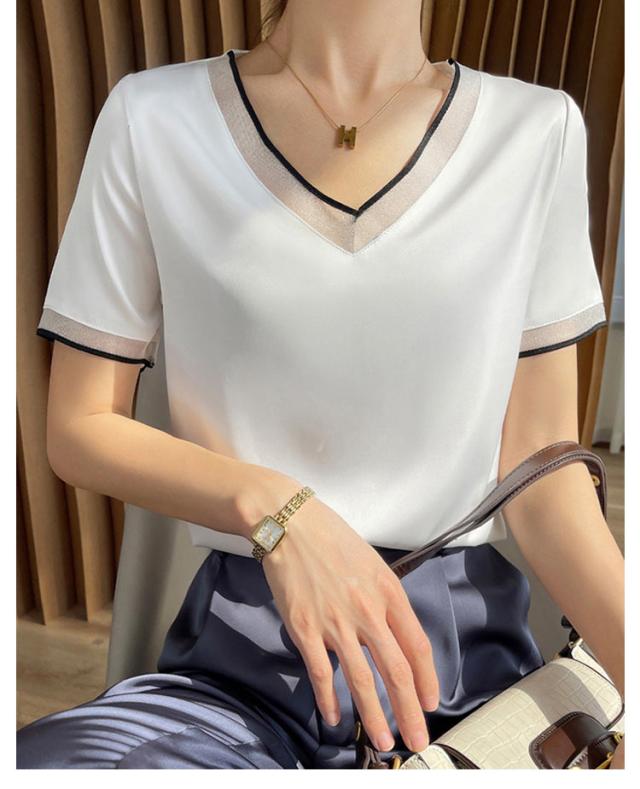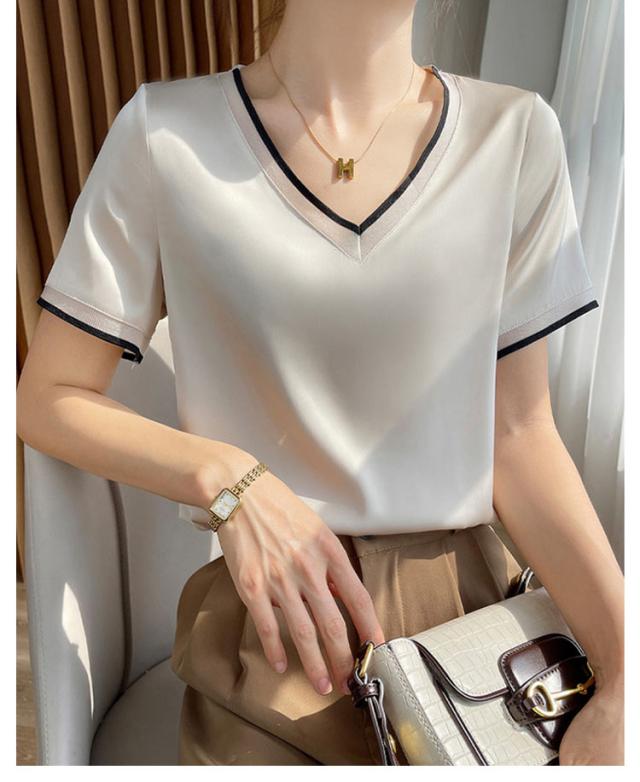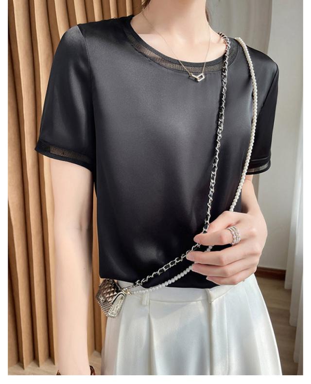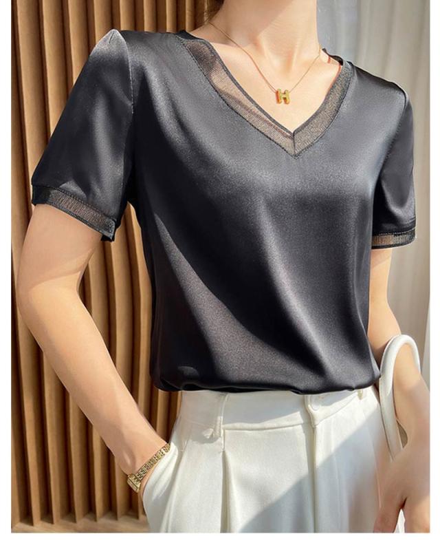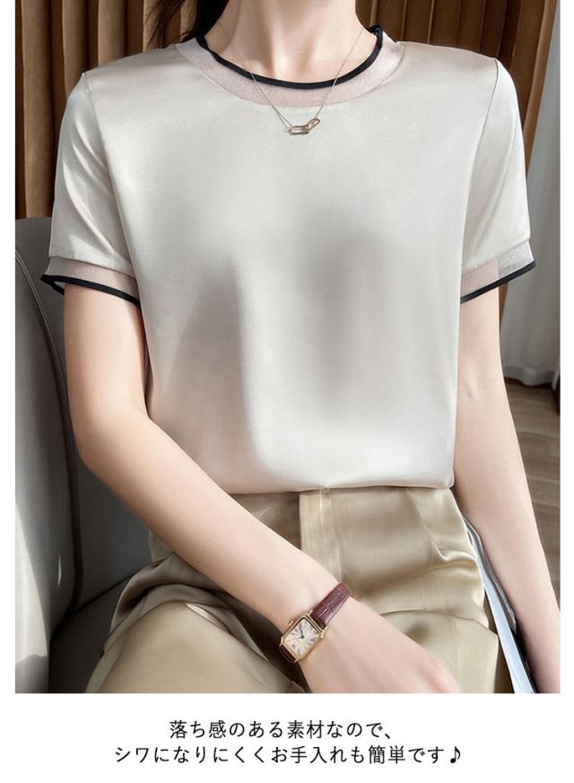 柔らか ブラウス レディース 半袖ブラウス シャツ 光沢感 半袖 サテン Vネック クールネック プルオーバー ブラウス シャツブラウス トップス 体型カバー インナー 大きいサイズ 薄手 無地 tシャツ 大人 女性 きれいめ