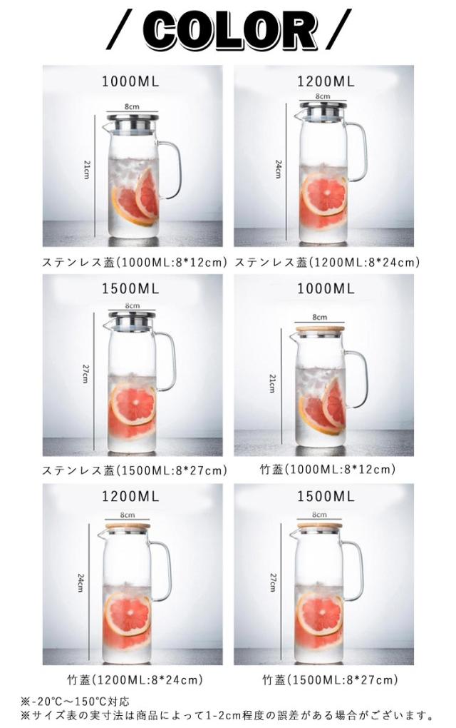 | 1L/1.2L/1.5L、使いやすい大容量ティーポット 麦茶、紅茶、ジュース、コーヒー、ミルクなどの飲み物を淹れたい時にご気楽にお使えいただけます。 -20℃〜150℃、耐熱ガラスので、温かい飲み物にも冷たい飲み物にも使える耐熱ガラス製のピッチャーです。 ボトルの口径が大きく、手が直接差し込めて清潔できます。 | |