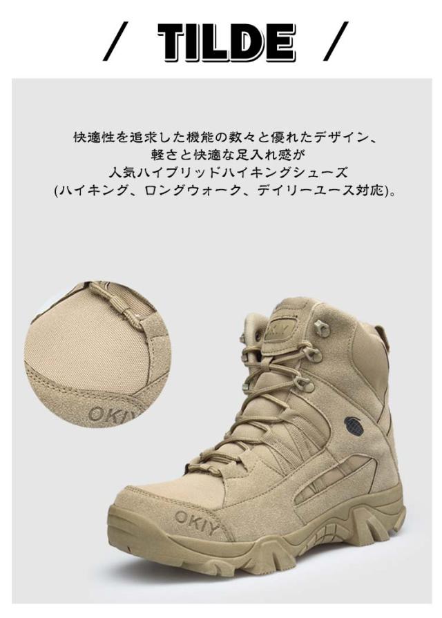 | 滑り止め 耐磨耗 衝撃吸収 撥水 防水 通気性 ミリタリーブーツ ・安定性とクッション性を両立し、履き心地のよさを追求したトレッキングシューズです。 ・ナイロンメッシュ・タングで通気性、マルチダイレクション・アンクルフレックスで足首の動きやすさと適度なサポートを両立。 ・快適性を追求した機能の数々と優れたデザイン、軽さと快適な足入れ感が人気ハイブリッドハイキングシューズ(ハイキング、ロングウォーク、デイリーユース対応)。 ・街中と違って傾斜のある岩や土の上を歩く登山では、専用の靴が必須。土の上でも滑りにくく、軽くてクッション性もあるので一日中歩いても疲れにくい。 ・しっかり足を保護するトレッキングシューズなら、キャンプ場のような未舗装の場所でも歩きやすく、怪我の防止にもなります。 ・落ち着いた色味のブラックとサンドカラーで、普段履きとしても違和感のないデザインです。長時間でも疲れにくく水にも強いので、普段の外出や旅行にもおすすめです。 | |
