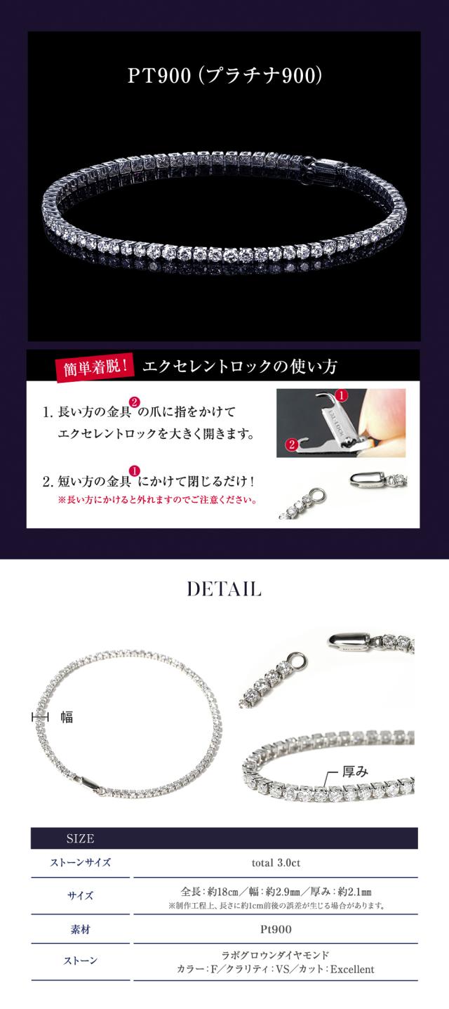 《商品詳細》 天然ダイヤモンド・ラボグロウンダイヤモンド・モアサナイトの違いとは? ストーンサイズ total 3.0ct(F-VS-EX) サイズ 全長:約18cm/幅:約2.3mm/厚み:約2.1mm ストーン ダイヤモンド ラボ・グロウン・ ダイヤモンドは最新テクノロジーが生み出した合成ダイヤモンドです。 地金素材 Pt900 付属品 ジュエリーBOX 品質保証書 ※金属アレルギーの反応は個人差がございます。全ての方にアレルギー対応ではないことを保証するものではございません。