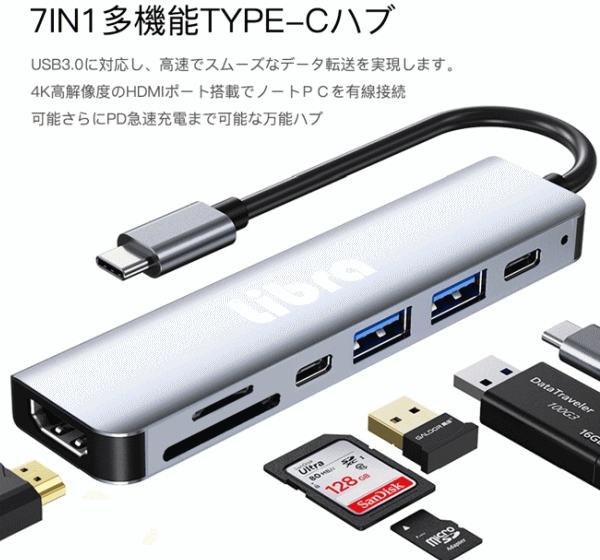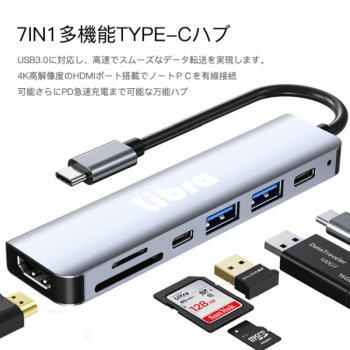 Libra TYPE-Cハブ USBハブ PD電源入力ポート付き HDMI出力付き TYPE-C 7in1ドッキングステーション LBT-TC7DS 4K30Hz対応HDMI出力 ネコポス