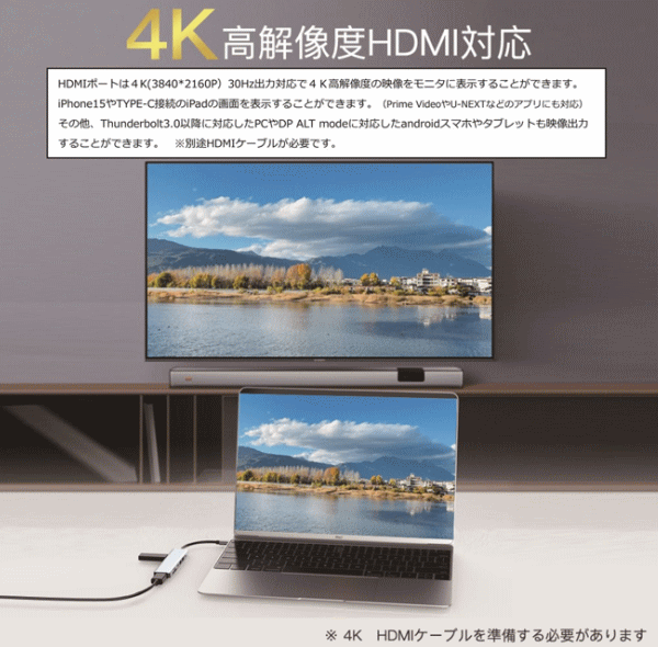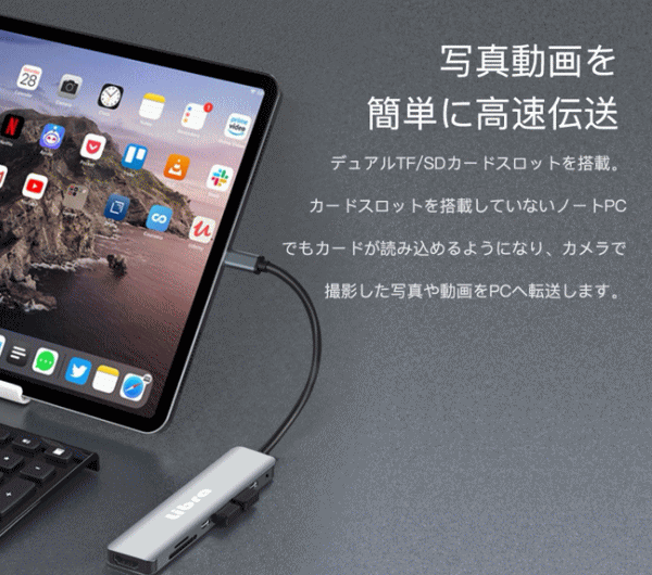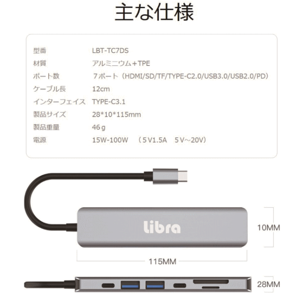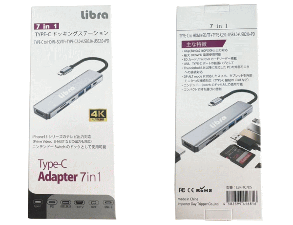 TYPE-C。知れば知るほど便利な規格ですね!今後様々なデバイスにとって主流になるTYPE-Cですがそれを更に拡張する便利なガジェットが新登場。他にも似たような製品はたくさんあるのですが「PD電源入力ポート付き」「HDMI出力付き」この2点が特にお勧めできるポイントとなっております!■品名:Libra TYPE-C7in1ドッキングステーション 4K30Hz対応HDMI出力■型番LBR-TC7DS■主な仕様:カードリーダー機能(SD/microSD)、ハブ機能TYPE-C2.0、USB3.0、USB、2.0、PD電源入力ポート搭載、HDMI 4K(3840*2160P)30Hz出力対応、iPhone15シリーズ・TYPE-C接続のiPadのテレビ出力可能(Prime Video、U-NEXTなどの出力も対応)、ニンテンドーSwitchのドックとして使用可能、Thunderbolt3.0以降に対応したPCの外部モニタへの出力対応、DP ALT modeに対応したスマホ・タブレットの外部モニタへの出力対応、コンパクトで持ち運びに便利な約46g【ネコポスでの発送】