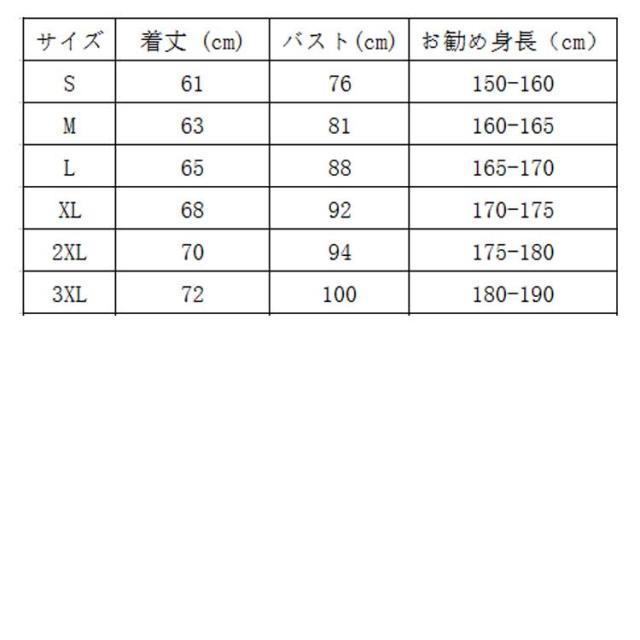 | サイズについての説明 | サイズ 着丈 バスト 袖丈 お勧め身長(cm) ※サイズ表の実寸法は商品によって1-3cm程度の誤差がある場合がございます。 |