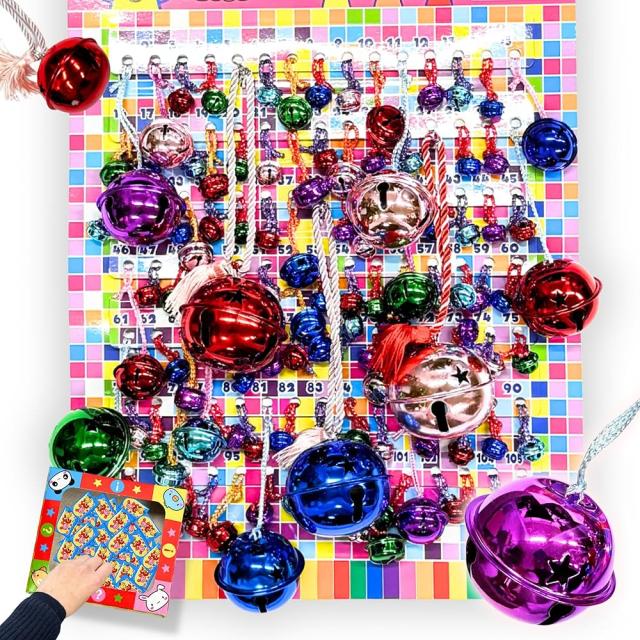 色とりどりの かわいい 鈴が100個付いた 台紙型 のくじで、数字を引いてその番号の鈴をプレゼント! キラキラ した見た目とチリンチリンと鳴る楽しい音で、五感をくすぐるアイテムです♪