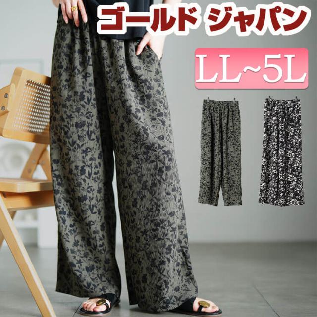 春新作 大きいサイズ レディース パンツ ズボン 花柄楊柳ワイドパンツ ボトムス ロングパンツ ワイドパンツ 花柄パンツ ロング ワイド 花柄 柄 フラワー 楊柳 ポケット ウエストゴム ギャザー ゆったり 夏服 秋服 春服 LL 2L 3L 4L 5L ブラック 黒 カーキ ゴールドジャパン