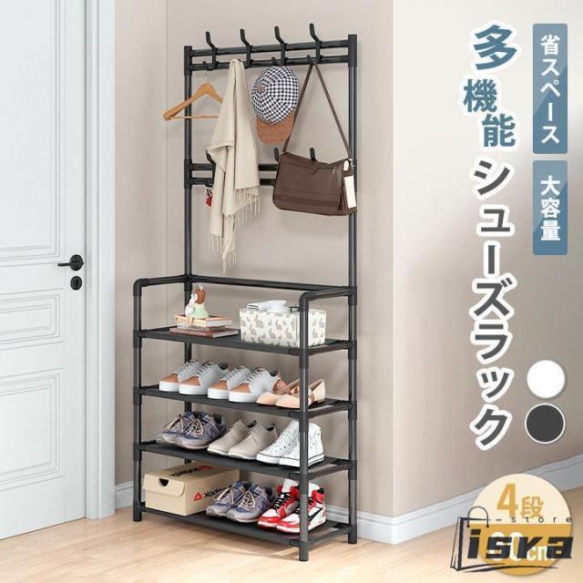 フック付き シューズラック 4段 60cm ハンガー ラック 玄関 靴 棚 帽子 カギ 収納 スリム 大容量 小物置き 下駄箱 白 黒 組立式 工具不要 省スペース