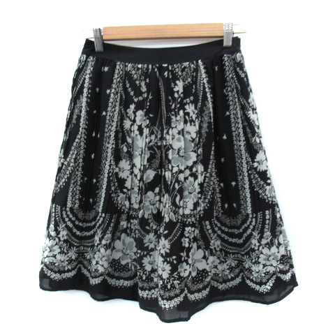 【中古】クミキョク 組曲 KUMIKYOKU プリーツスカート ひざ丈 総柄 1 黒 ブラック オフホワイト /SM6 レディース