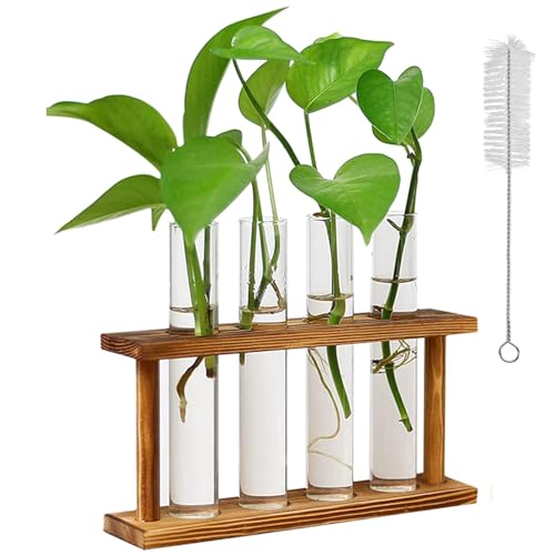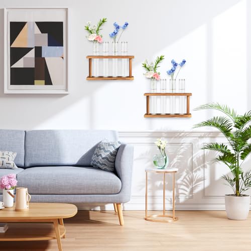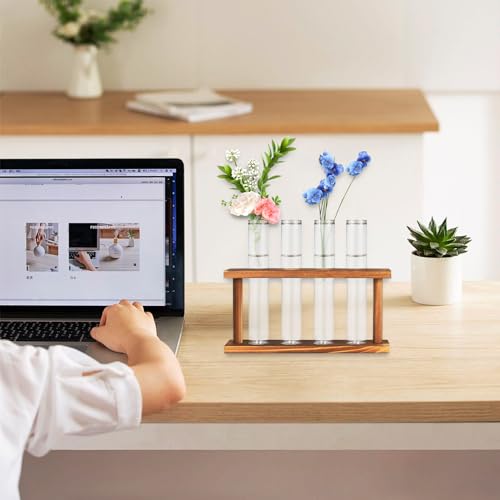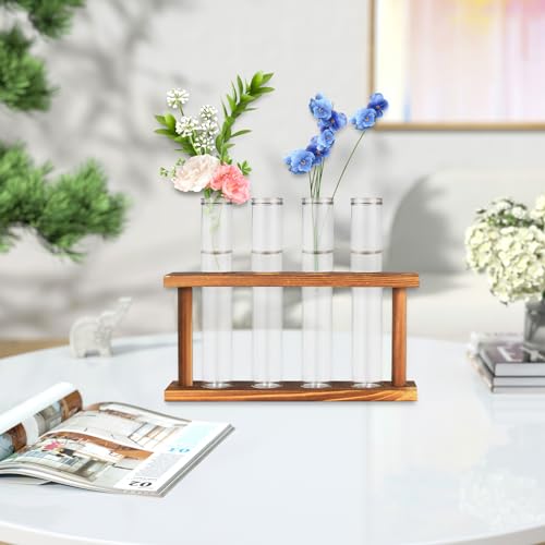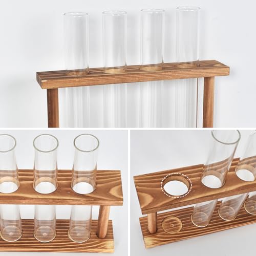 【エレガントな装飾】レトロな色合いの天然木のラックと透明ガラスの試験管花瓶4個。植物を花瓶に入れて、天然木の棚に置くと、自宅で自然な雰囲気を感じ、家族環境に自然な色をもたらすことができます。
