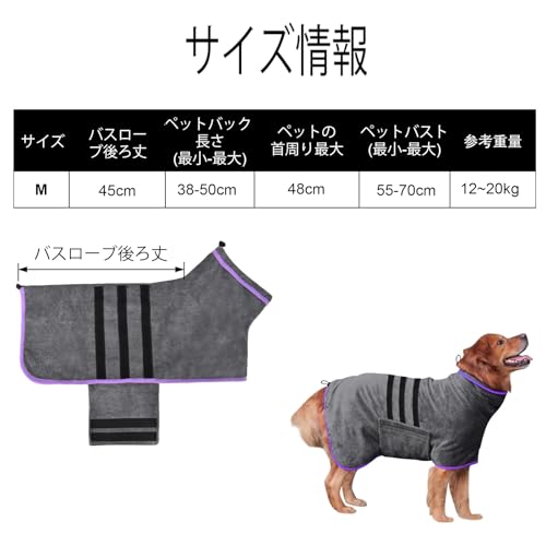 【Mサイズ】バスローブの後ろ丈は45cmです。 コーギー、パグなどの背丈38〜50cm、胸囲55〜70cm、首回り48cmまで、体重12〜20kgの犬に適しています。