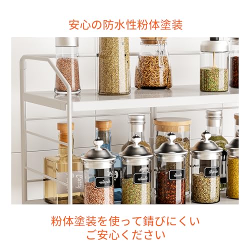 【高い耐荷重と優れた安定感】この調味料収納ラックは最大20kgの荷重に耐えることができます。滑り止めコムが付属しており、ラックの安定性を一層高めています。重たい調味料瓶やキッチン用品を置いても安定して使用できる設計です。