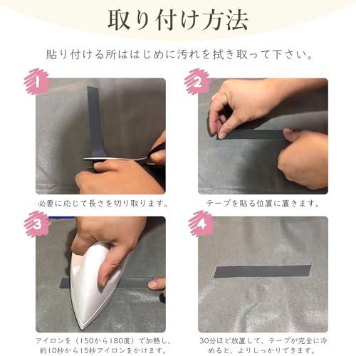 【使いやすい】布地の汚れを取り除き、シームシーリングテープを表面を上にして補修部分に置き、アイロンを綿麻ギア(150から180度)で加熱します。約10秒から15秒アイロンをかけます。薄い布地を補修するときは、アイロンをかけすぎないように注意してください。*アイロン掛け時間は10秒から15秒をお勧めしますが、薄い布地は接着時間は少し短くすることができます。