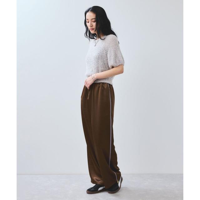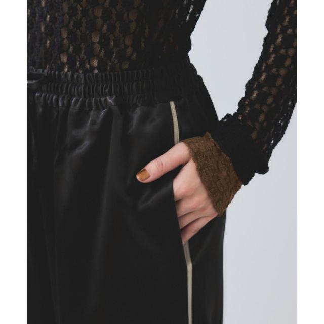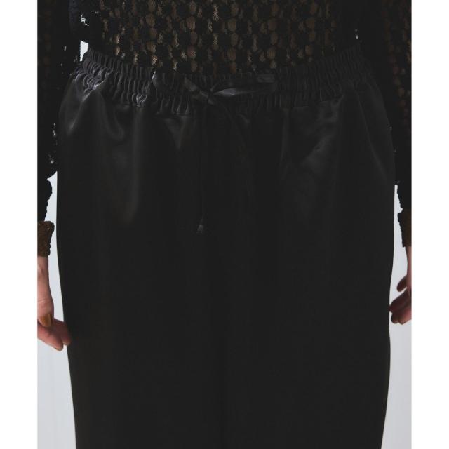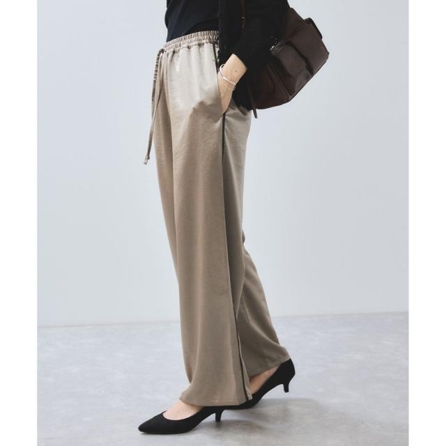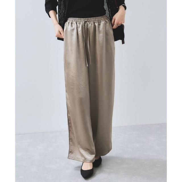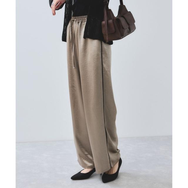 リラクシーな穿き心地ながら、サテン特有の上品なツヤ感で大人っぽく決まる一本。サイドに施した配色ラインが縦のラインを引き立て、脚をスッキリと見せてくれます。ややゆとりを持たせたストレートラインと総ゴム仕様のウエストで、着心地はラクなのにきちんと見え。ワイドすぎない絶妙なボリューム感で、トップスを選ばずバランスよく着こなせるシルエットです。