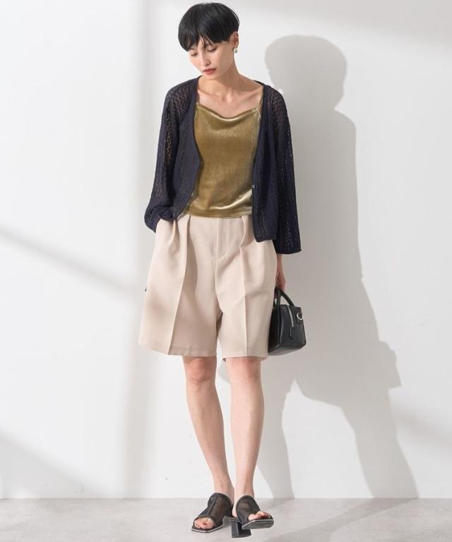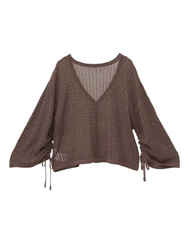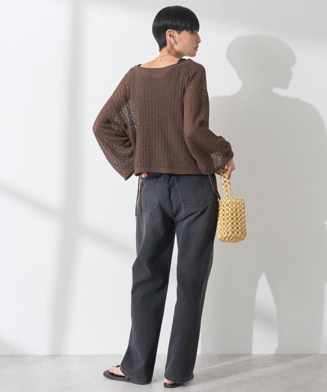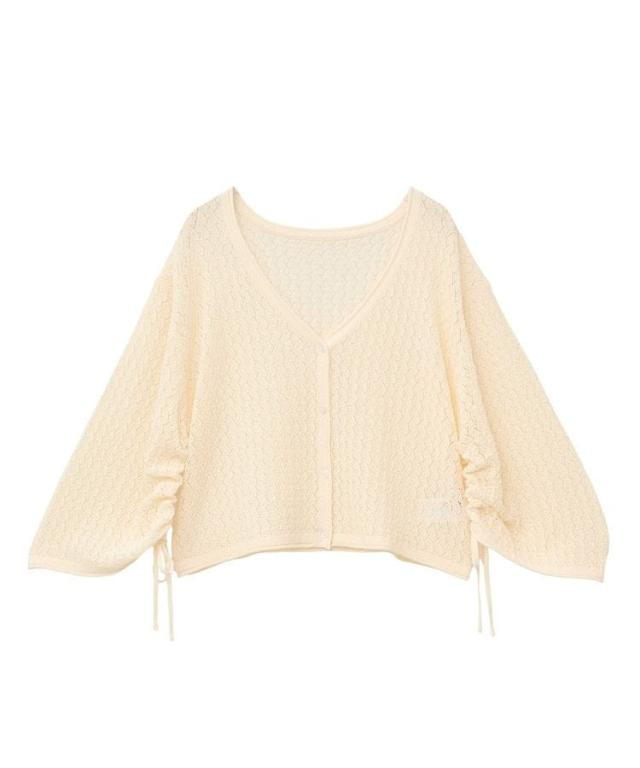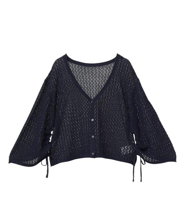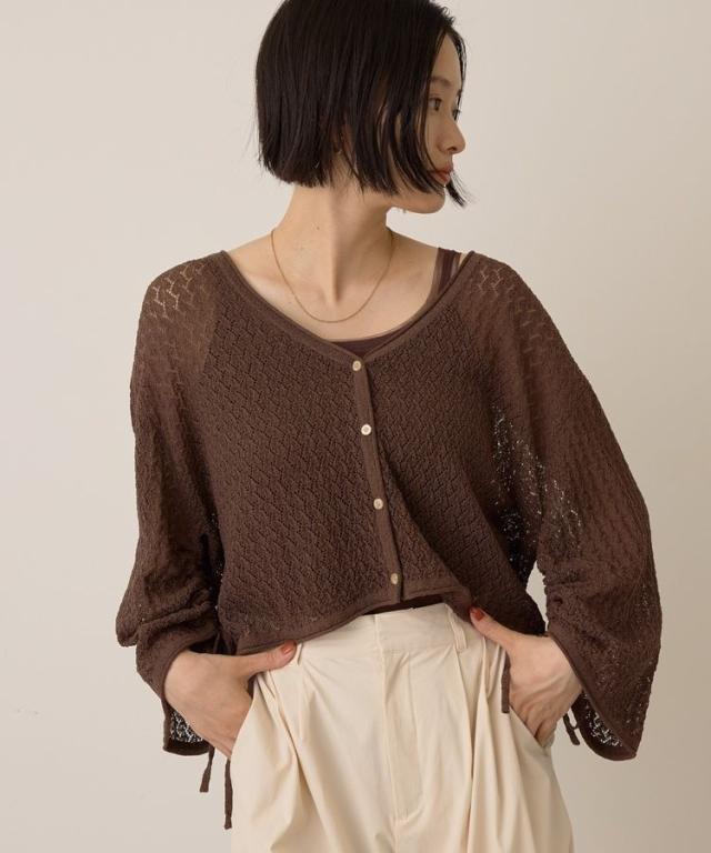 繊細な透かし編みレース素材がフェミニンムードを引き立てるカーディガン。前後どちらを前にしても着用できる2WAY仕様でスタイリングの幅も広がります。袖にドロストリボンを施し、気分に合わせてシルエットを変えられるのも嬉しいポイント。短丈のゆったりしたサイズ感で着心地よく、様々なボトムと着合わせしやすいおすすめのアイテムです。透け感[ややあり]