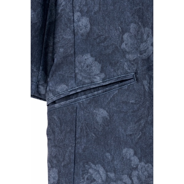 滑らかな風合いと高いストレッチ性が特徴のポリエステルサマーハイテンション素材に、フラワーデニム柄をプリント。