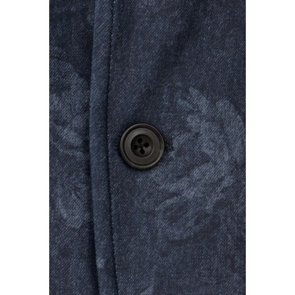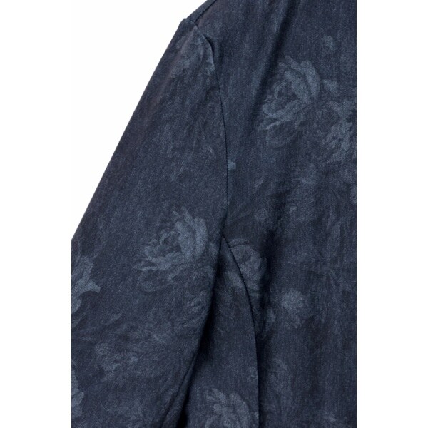 デニム調のプリントに繊細な花柄シルエットが浮かび上がる、7分袖のスタンドジャケット。