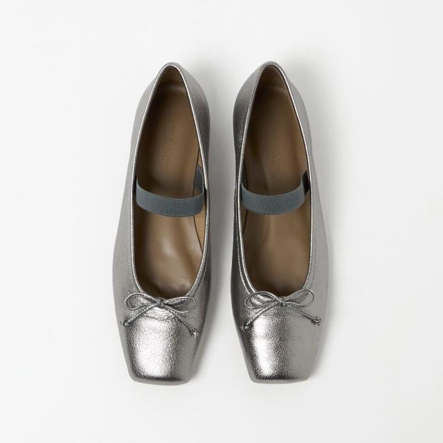 やや深めの履き口とスクエアのトゥ先が落ち着いた雰囲気を演出し、可愛くなりがちなバレエシューズをモードでトレンド感ある一足へと格上げ。