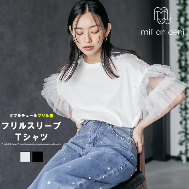 春新作 チュールフリル袖Tシャツ M 袖フリル 裾ラウンド ミドル丈 ゆったり レディース トップス 春夏 メール便(郵2) ミリアンデニ t198333