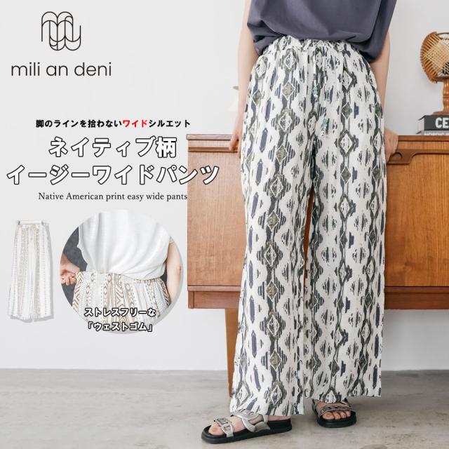 春新作 ネイティブ柄イージーワイドパンツ ウェストゴム サイドポケット ドローストリング 春夏 ボトムス M ミリアンデニ メール便(郵2) p61041