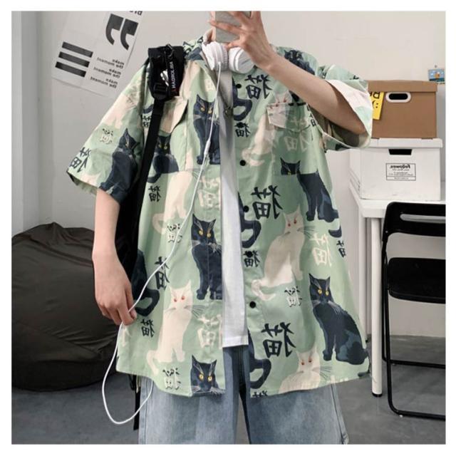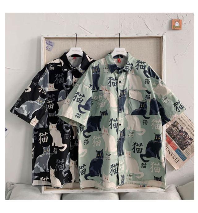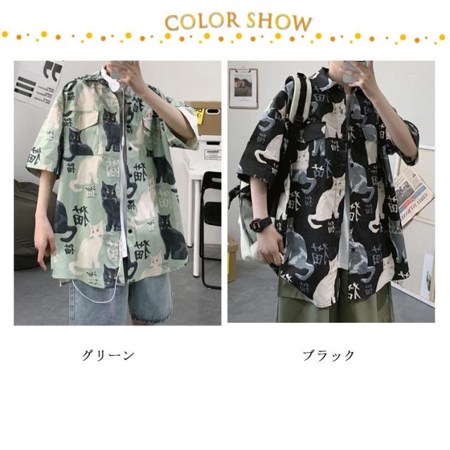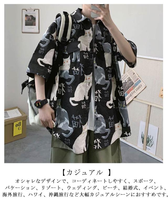 羽織り アロハシャツ トップス メンズ 開襟シャツ 半袖 春夏 前開き 五分袖 猫柄 薄手 プリント 半袖シャツ シャツ プリント カジュアルシャツ オーバーサイズ 大きいサイズ ゆったり 可愛い おもしろ 夏 ビーチ カジュアル 通気 ねこ かわいい おしゃれ カジュアル