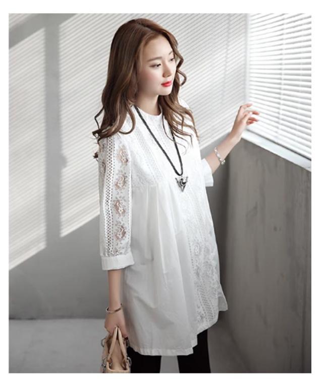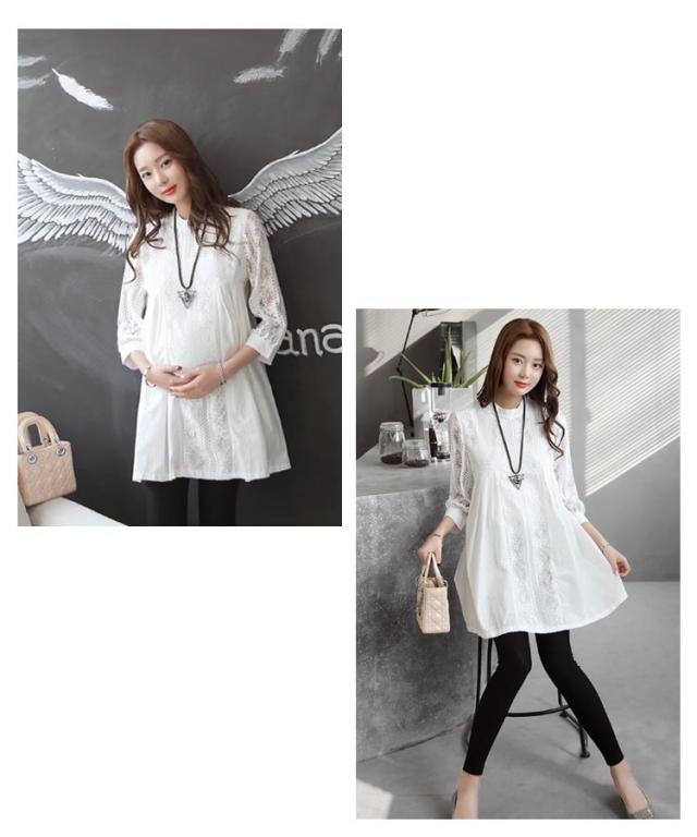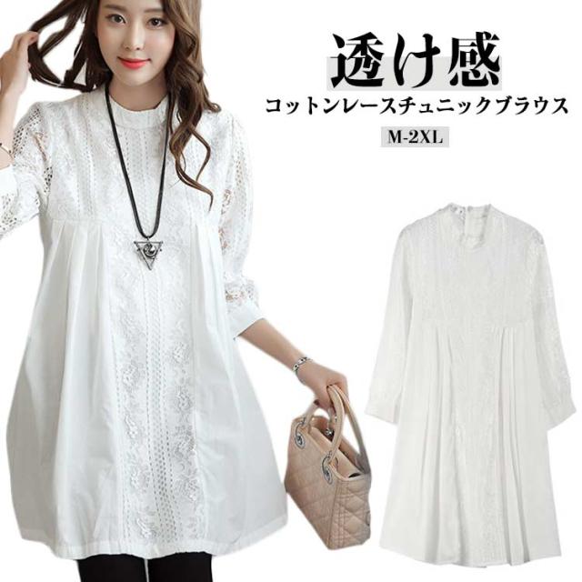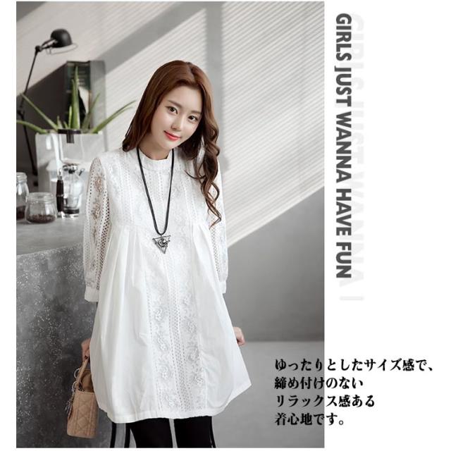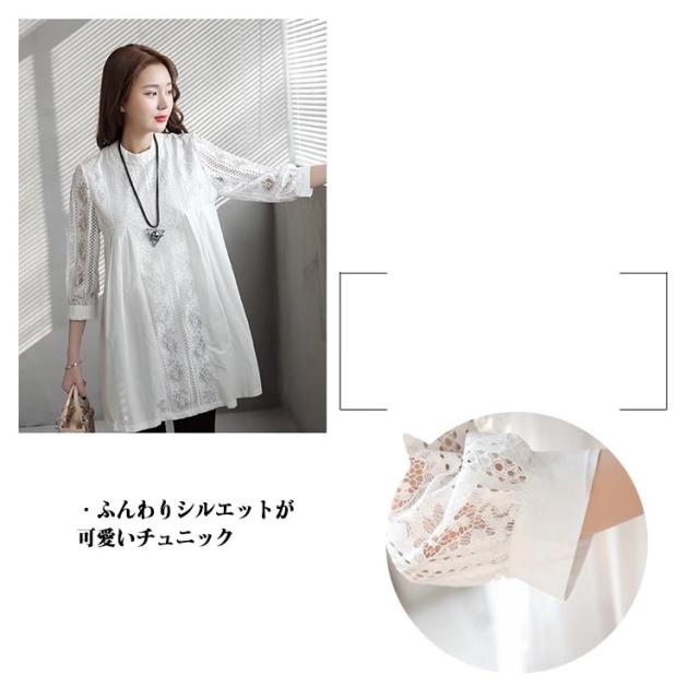 マタニティ チュニック レース 七分袖 綿 コットン プルオーバー スカラップレース 透け感 体型カバー トップス ブラウス Aライン お尻が隠れる 春 夏 大人可愛い