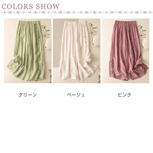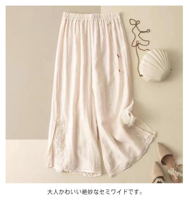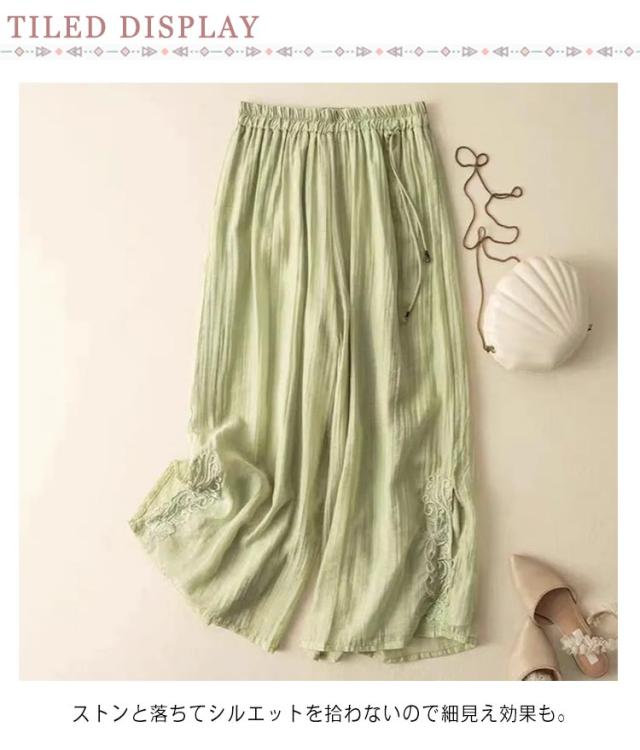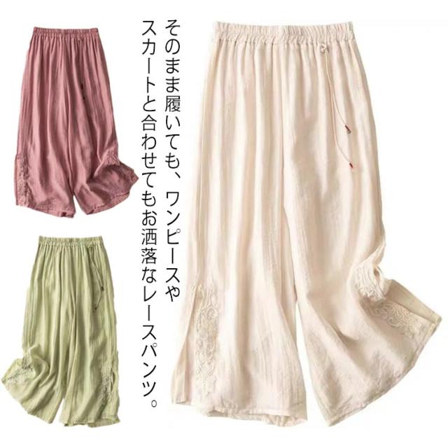 | そのまま履いても、ワンピースやスカートと合わせてもお洒落なレースパンツ。 ストンと落ちてシルエットを拾わないので細見え効果も。 ウエストゴムで楽ちんかわいい! 大人かわいい絶妙なセミワイドです。 スリット&刺繍が上品に美しくみせます。 | |