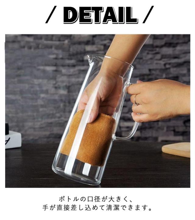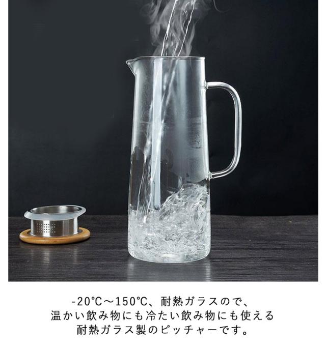 | 1L/1.2L/1.5L、使いやすい大容量ティーポット 麦茶、紅茶、ジュース、コーヒー、ミルクなどの飲み物を淹れたい時にご気楽にお使えいただけます。 -20℃〜150℃、耐熱ガラスので、温かい飲み物にも冷たい飲み物にも使える耐熱ガラス製のピッチャーです。 ボトルの口径が大きく、手が直接差し込めて清潔できます。 | |