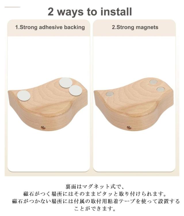| 木目がオシャレな天然木のドアベル! 和洋を問わず、玄関の雰囲気を壊さずさりげなく馴染むシンプルなデザイン。 玄関ドアやお部屋のドア、収納棚の扉、冷蔵庫のドア、お店の出入り口のドアなど、設置場所は色々! 裏面はマグネット式で、がつく場所にはそのままピタッと取り付けられます。 がつかない場所には付属の取付用粘着テープを使って設置することができます。 | |