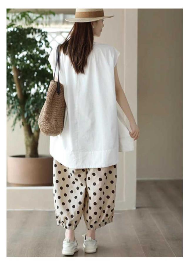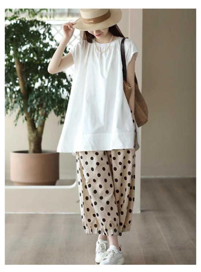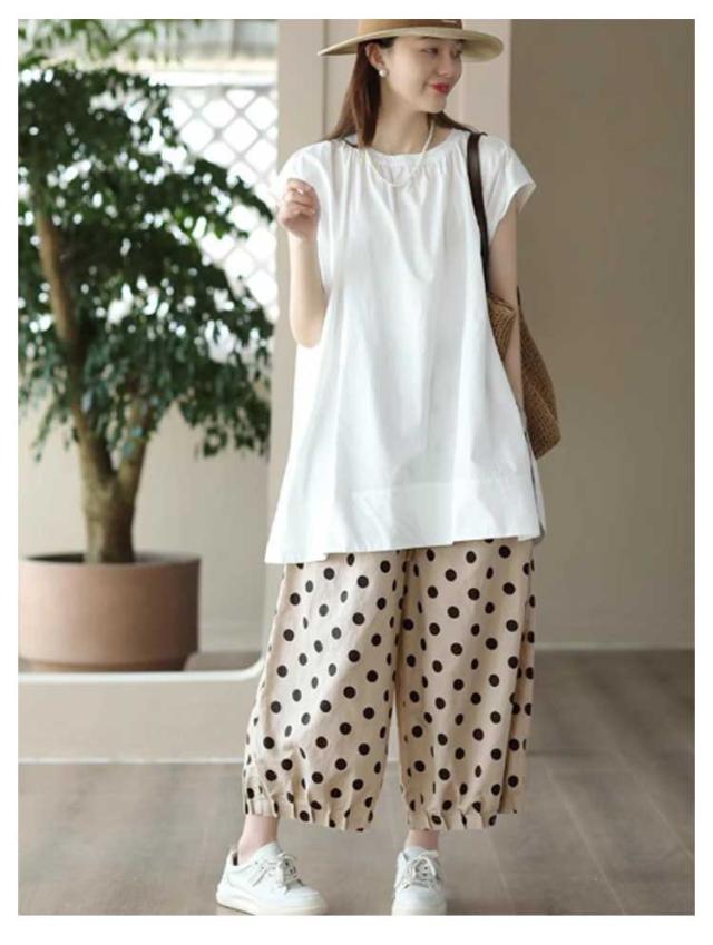 | 大人かわいいドット柄のワイドパンツ 広がりすぎないデザインで、穿くだけでスッキリシルエットが完成します。 シワになりにくいさらりとした落ち感のある薄手生地を使用。 伸縮性抜群のウエストゴムでお腹周りも楽ちん ドット柄が"オトナ可愛い"を演出!爽やかに穿ける楽ちんワイドパンツ。 | |