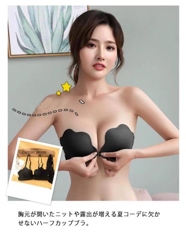 | 肩や胸元のあいたドレスに絶対おすすめ、ずれ落ちないストラップレスブラ。 フロントホックもデザインされているので、ズレずにキープ! 伸縮性高い素材を使用して、締め付け感もなし、ノンストレスの着心地です。 バストをサポートし、立体的なバストシルエットをキープし谷間メイク! 胸元が開いたニットや露出が増える夏コーデに欠かせないハーフカップブラ。 ストラップを取り付けることができるため、2wayブラとしてお使いいただけます。 通気性のある肌触りの良い柔らかい生地、長時間心地良く着用できます。 | |