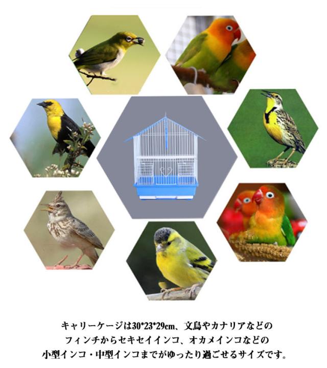 | 鳥用キャリー キャリーケージは30*23*29cm、文鳥やカナリアなどのフィンチからセキセイインコ、オカメインコなどの小型インコ・中型インコまでがゆったり過ごせるサイズです。 ドライブ・散歩・通院等の持ち運びに便利なハンドル付き。 小鳥を入れたまま楽に移動することが可能です。 ケージの中心部は金網になっているため、通気性がよくケージ内の空気循環を確保できます。 エサ入れ・止まりリング付きのセットです。 引き出しつきトレイでお掃除がラクです。 ※あらかじめトレイに新聞紙などを敷いておくと、お掃除がしやすくなります。 | |
