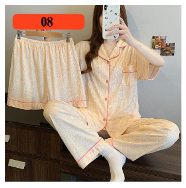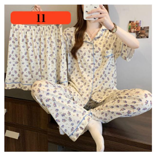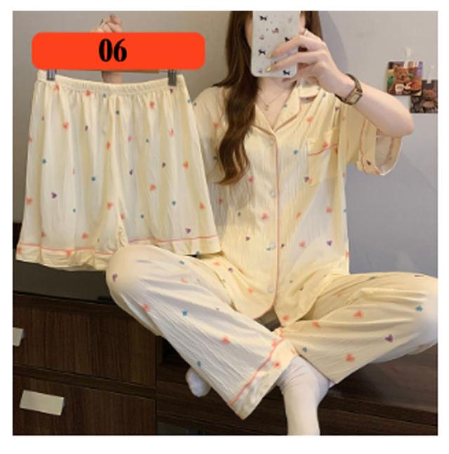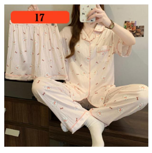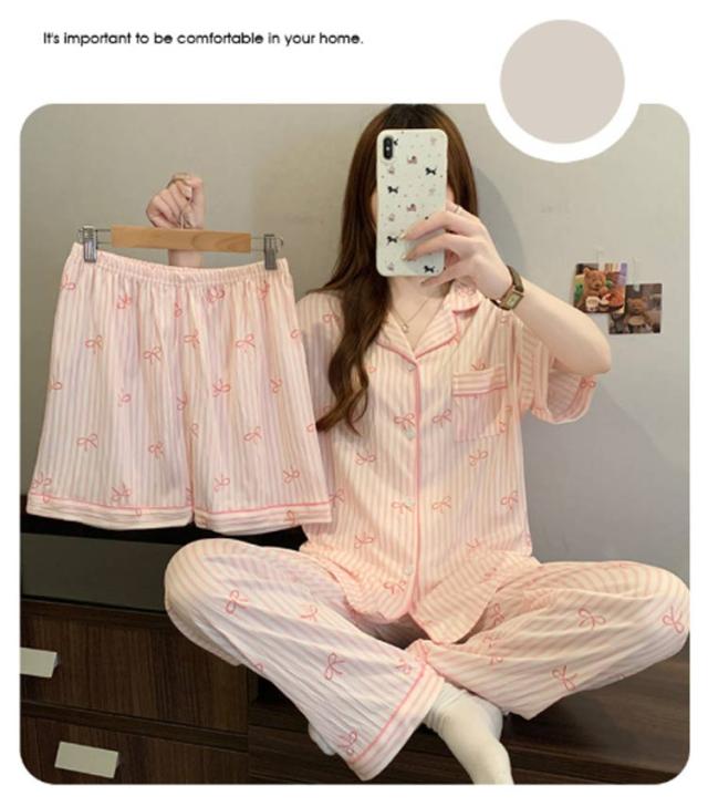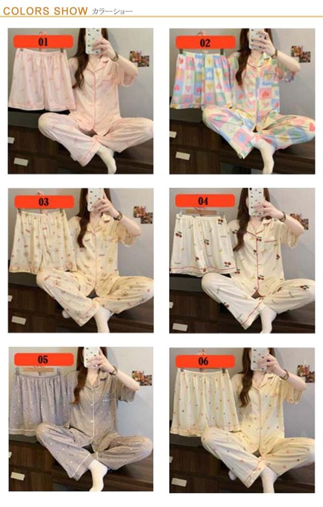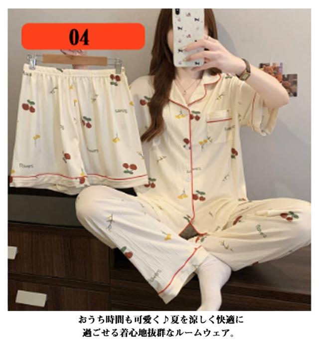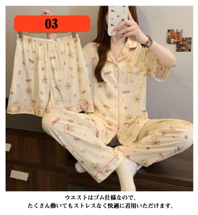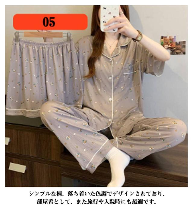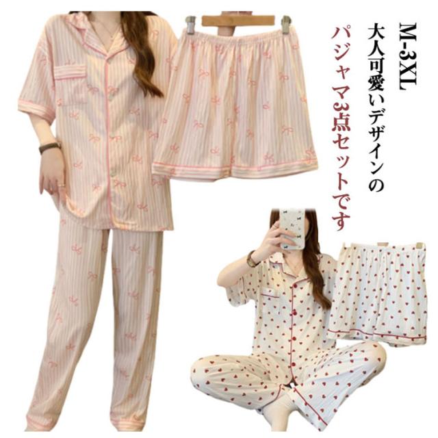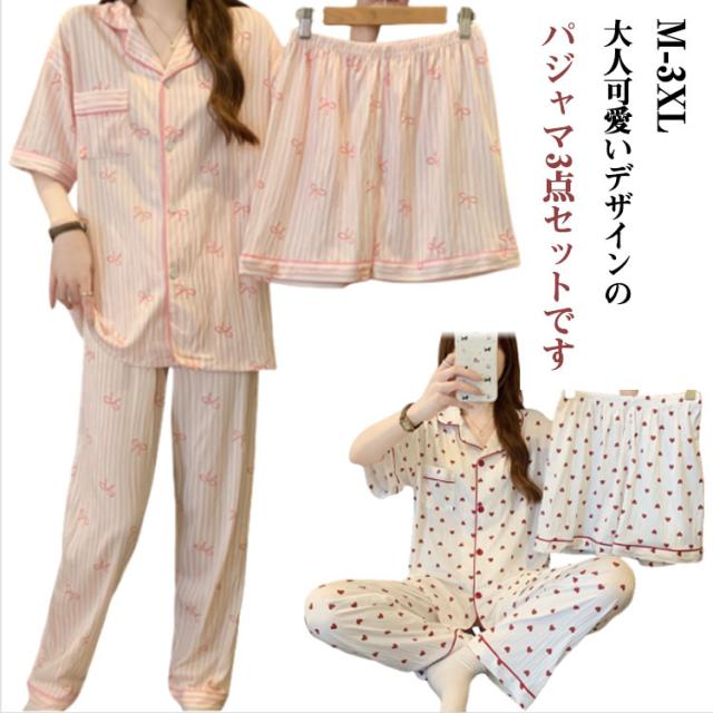 | M-3XL 大人可愛いデザインのパジャマ3点セットです。 前開き前ボタンタイプで着やすいので、授乳や入院などにもおすすめ。 ウエストはゴム仕様なので、たくさん動いてもストレスなく快適に着用いただけます。 おうち時間も可愛く♪夏を涼しく快適に過ごせる着心地抜群なルームウェア。 シンプルな柄、落ち着いた色調でデザインされており、部屋着として、また旅行や入院時にも最適です。 | |