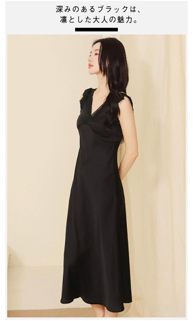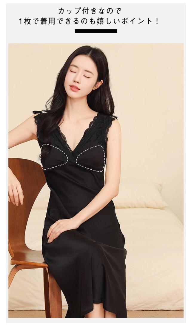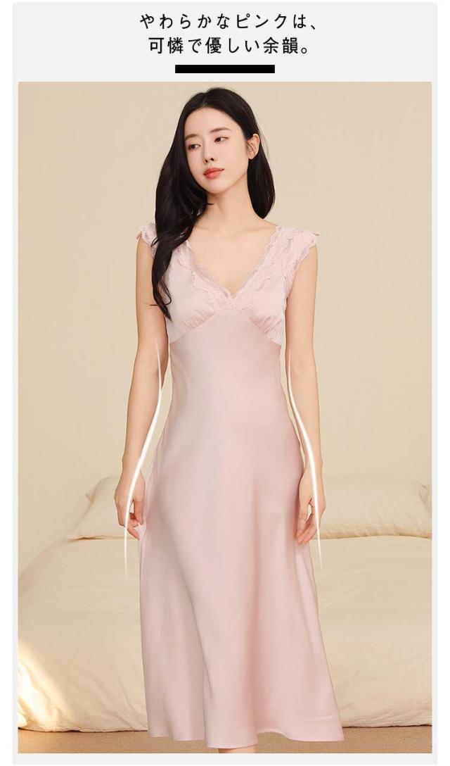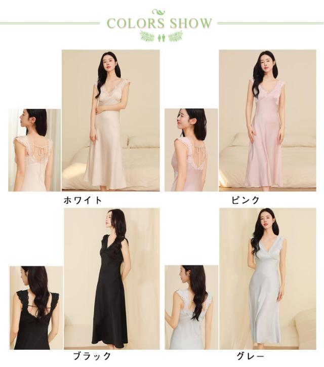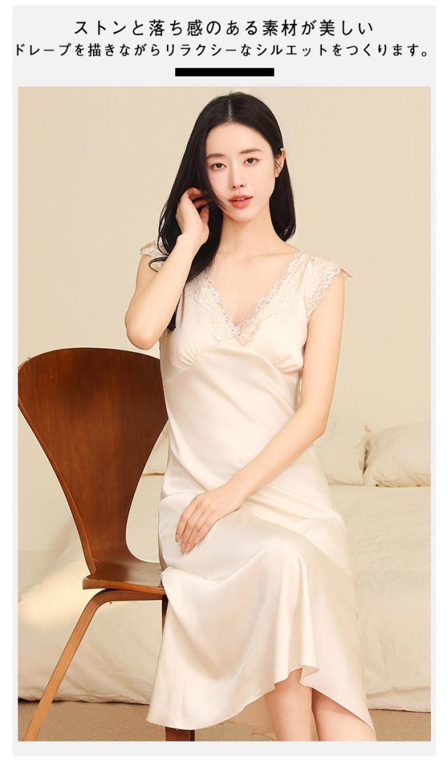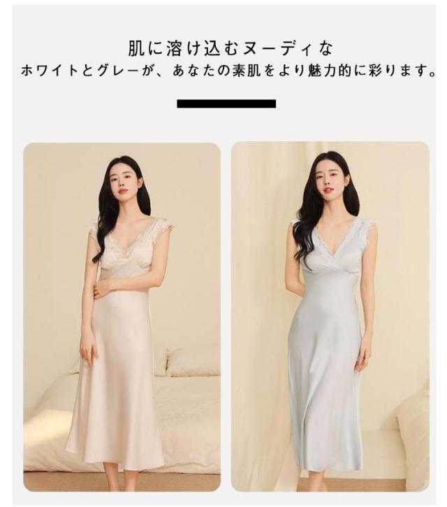 | やわらかなピンクは、可憐で優しい余韻。深みのあるブラックは、凛とした大人の魅力。肌に溶け込むヌーディなホワイトとグレーが、あなたの素肌をより魅力的に彩ります。 バックリボンが背中で優雅に揺れ、後ろ姿まで美しいロングドレスです。胸元に施された繊細なレースは、女性らしさを引き立てます。 カップ付きなので1枚で着用できるのも嬉しいポイント! サテンの柔らかく滑らかな質感が肌に寄り添い、贅沢なひとときを演出します。 ストンと落ち感のある素材が美しいドレープを描きながらリラクシーなシルエットをつくります。レースから透かす肌は、大人の余裕と色香を際立たせて。ふんわりとした落ち感でAラインシルエットをつくるので、ボディラインを拾わずゆったり着られます。 | |