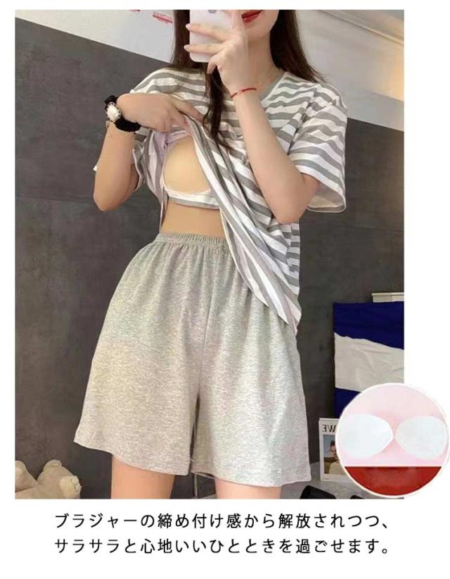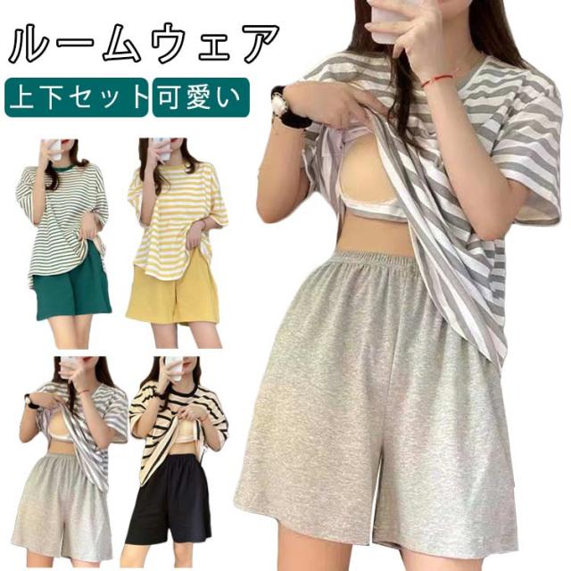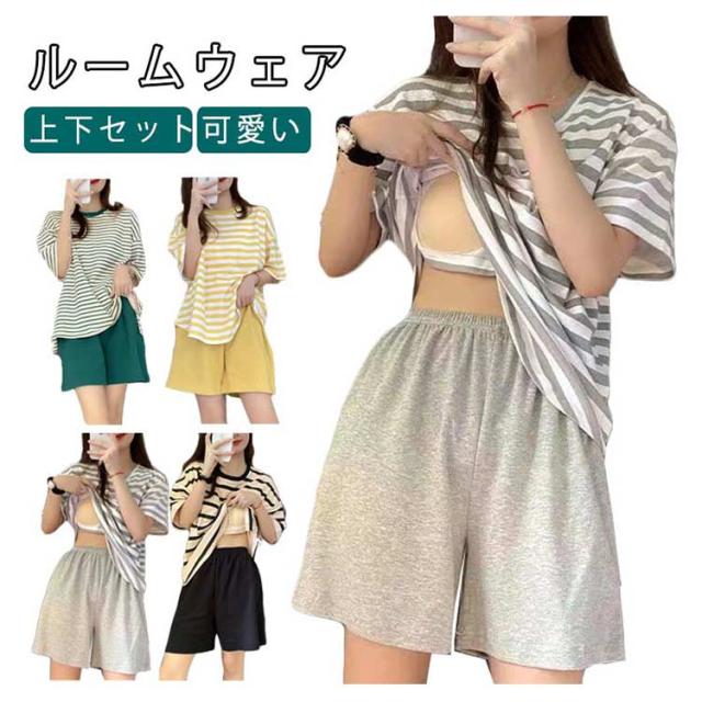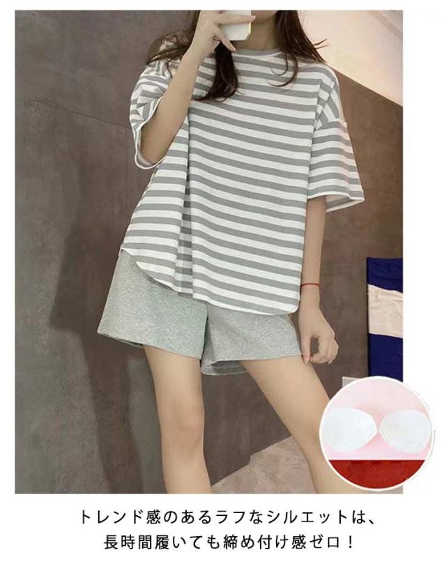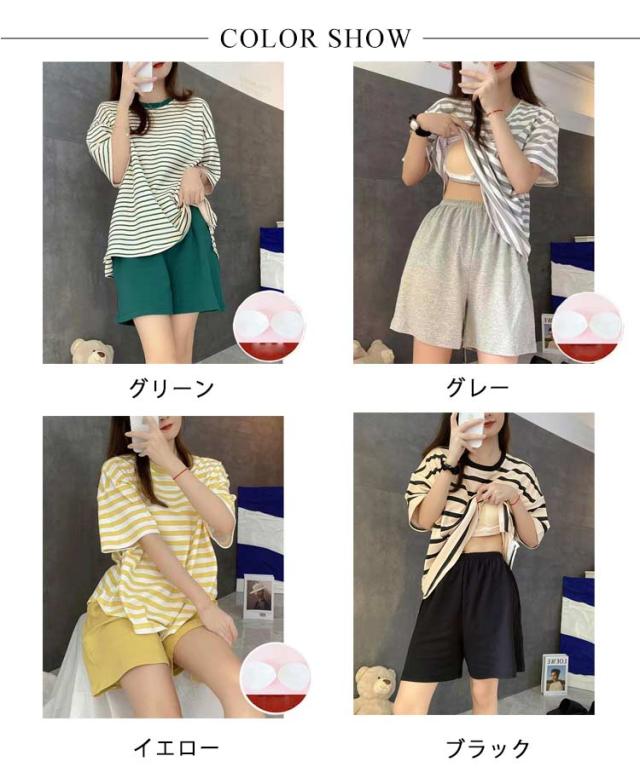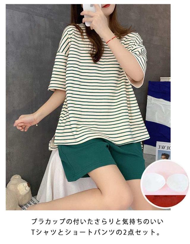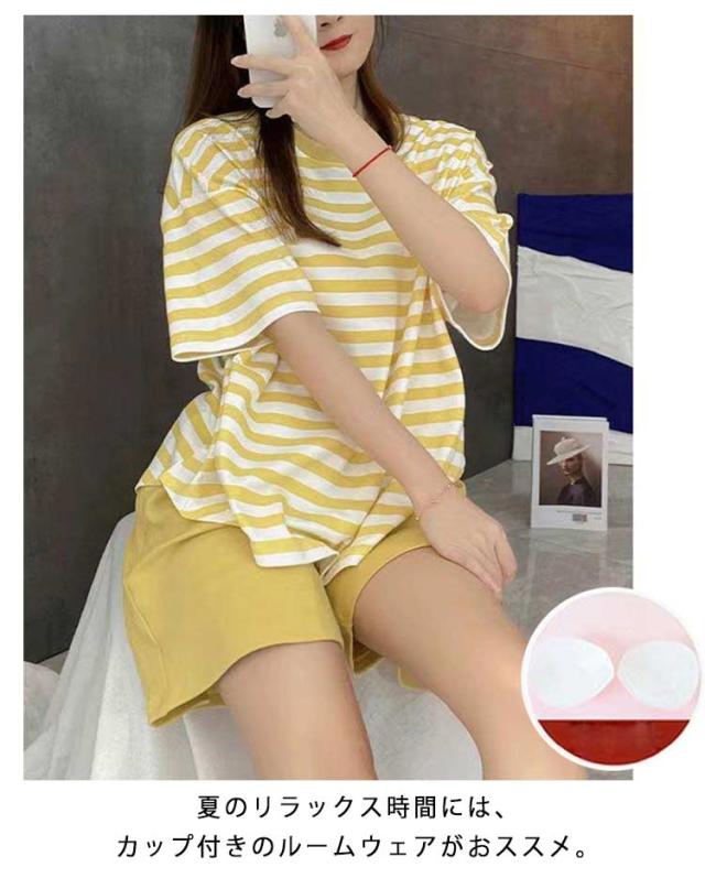 ルームウェア 夏服 レディース 上下セット ショートパンツ ルームウェア お洒落 トップス 半袖Tシャツ カップ付き ボーダー 部屋着 セットアップ パジャマ カジュアル オーバーサイズ ラウンドネック ウエストゴム