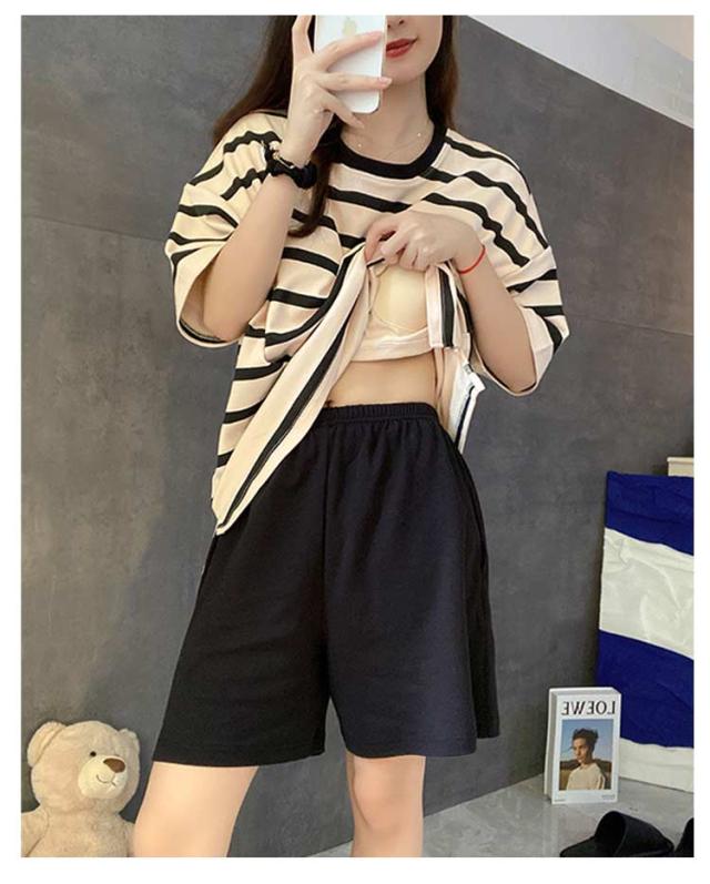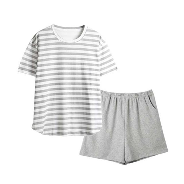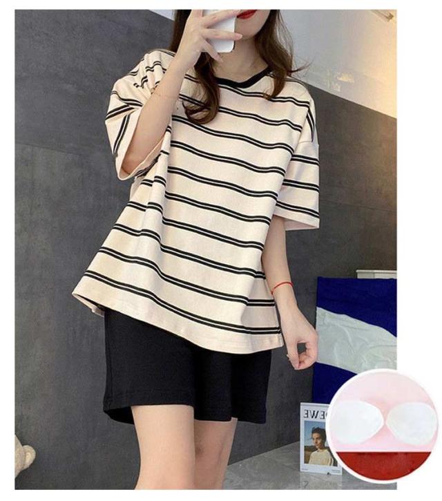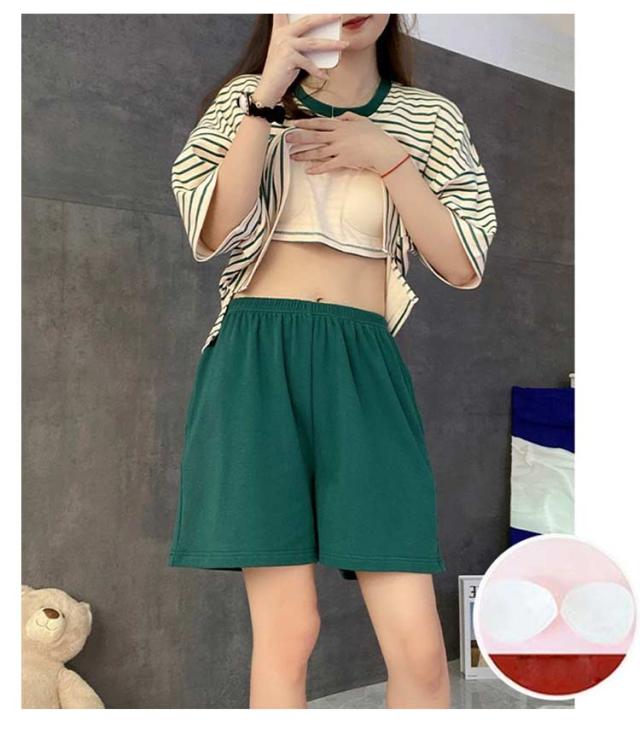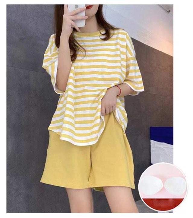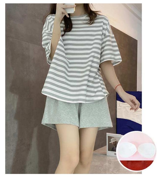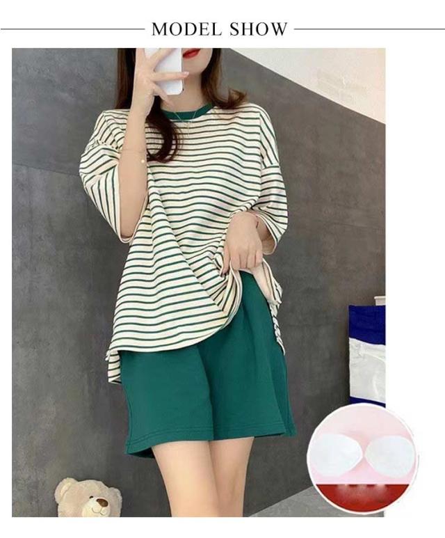ルームウェア 夏服 レディース 上下セット ショートパンツ ルームウェア お洒落 トップス 半袖Tシャツ カップ付き ボーダー 部屋着 セットアップ パジャマ カジュアル オーバーサイズ ラウンドネック ウエストゴム