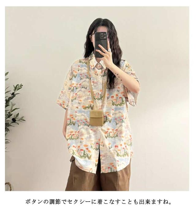 UV対策 シャツ レディース 5分袖 カジュアル ハワイアン アロハシャツ シャツ 総柄 チューリップ柄 ハワイシャツ 大きいサイズ 日焼け止め服 可愛い ゆったり 体型カバー 夏物 ヴィンテージ風 シンプル 半袖 ストリートリゾート 旅行 海 ビーチ