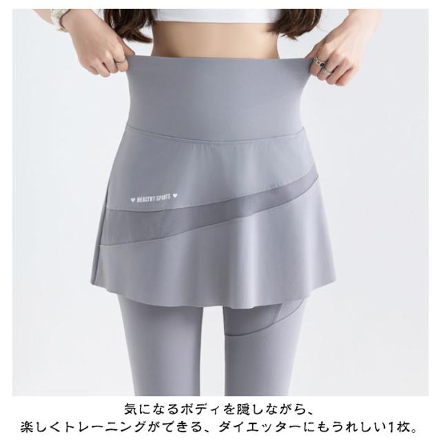 | スカート付きレギンスパンツ。【7分丈】 スカートを重ね着したようなドッキングデザインで、気になるヒップまわりをしっかりとカバー。 単色×無地のシンプルなデザインで、合わせるアイテムやシーンを選ばないのも◎ ヨガやピラティス、ジムトレーニングやランニングなどのワークアウトシーンにはもちろん、スカート付きでタウンユースまで可能です。 気になるボディを隠しながら、楽しくトレーニングができる、ダイエッターにもうれしい1枚。 ほど良い着圧で脚のラインがキュッと引き締まるので、スタイルアップ効果も期待できます。 | |