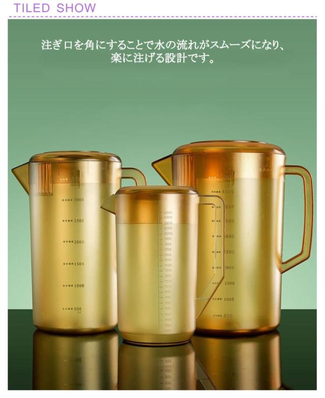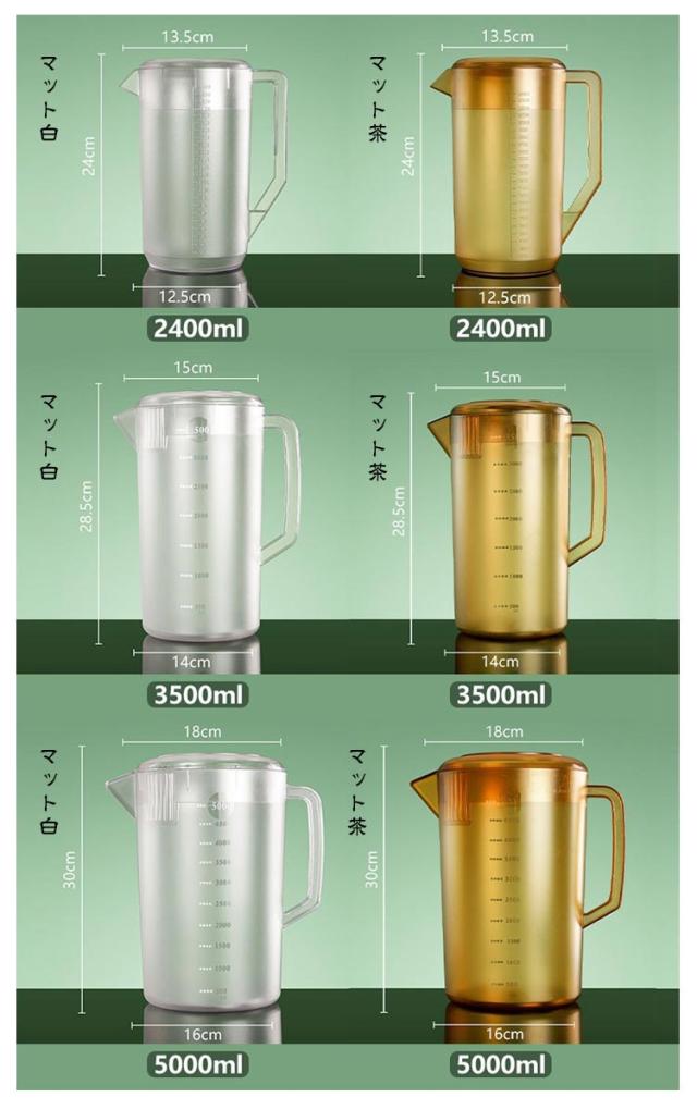 | 2400ML 3500ML 5000ML 大容量冷水ポット 便利な目盛り付き♪ 注ぎ口を角にすることで水の流れがスムーズになり、楽に注げる設計です。 プラスチックで軽く、ガラス製のようにちょっとした衝撃で割れる心配もありません。 大きい開き口、シンプル構造が、いちばん簡単に衛生管理出来ます。 大容量なので、夏場の麦茶作りにもおすすめです。 | |