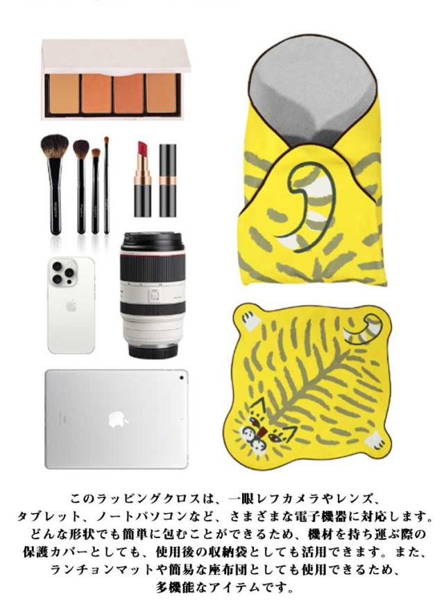| 【包むだけでポーチになる】 【50*50cm 60*60cm】 結ばず包めてカンタン。重ねると張り付く特殊生地なので中身のサイズや形状に関係なくフィット。不思議な保冷温マルチクロス。 お弁当用のランチクロスとしてはもちろん、ペットボトルを包んで使うこともできる多機能アイテム。 繊維どうしが密着くっつく特殊素材。結ばず、巻くだけで包めるストレスフリーな素材です。締め付けの強弱も自由自在。 このラッピングクロスは、一眼レフカメラやレンズ、タブレット、ノートパソコンなど、さまざまな電子機器に対応します。どんな形状でも簡単に包むことができるため、機材を持ち運ぶ際の保護カバーとしても、使用後の収納袋としても活用できます。また、ランチョンマットや簡易な座布団としても使用できるため、多機能なアイテムです。 この製品は化粧ポーチとしても使用でき、必要なものを簡単に収納できます。使用時にはクロスを広げて取り出しやすく、使い終わったら包んでそのまま持ち運べるため、非常に便利です。整理の手間が省け、忙しい朝でもストレスなく使えます。このシンプルさは女の子にとても人気! | |