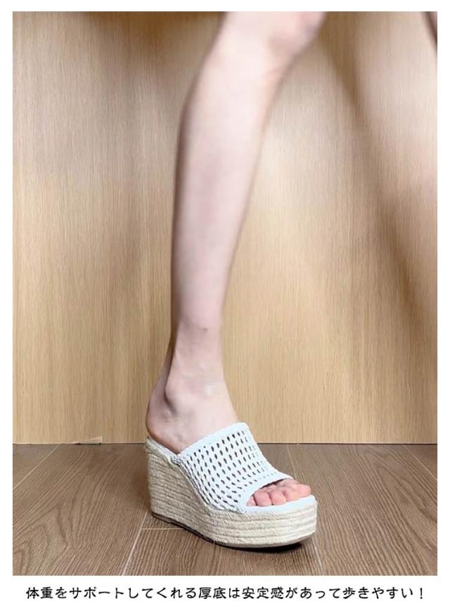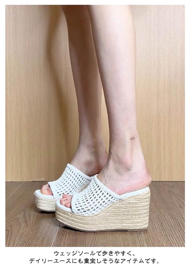 サンダル メッシュ レディース オープントゥ メッシュ ウェッジヒール 7センチヒール ミュール 脱げにくい ミドルヒール ホワイト 白 メッシュミュールサンダル 大きいサイズ ウェッジヒールミュール