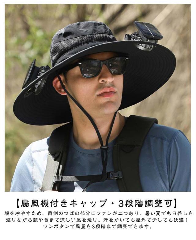 | 【扇風機付きキャップ・3段階調整可】 顔を冷やすため、両側のつばの部分にファンが二つあり、暑い夏でも日差しを遮りながら顔や首まで涼しい風を送り、汗をかいても屋外で少しでも快適! ワンボタンで風量を3段階まで調整できます。 【ソーラー+USB充電の多機能キャップ】 ソーラーパネルを日光を当てることで充電できます。 晴れの日にどこでもいつでも充電可能♪雲の日もUSB充電できるため、心配なし、安心で使うことができます。 【広いつば・通気性抜群】 広いつばで、紫外線遮蔽率は99%以上です。 両側はメッシュ素材で、通気性が抜群。蒸れない・吸湿・速乾性に優れ、夏だけでなく、オールシーズンに活躍していただけます。 【紫外線UV対策・熱中症対策】 アウトドアでの紫外線 UV対策だけではなく、軽量で通気性よく、 熱中症対策にも効果的! 蒸し暑さでは苦手しても、扇風機付きの帽子が大活躍しました! | |