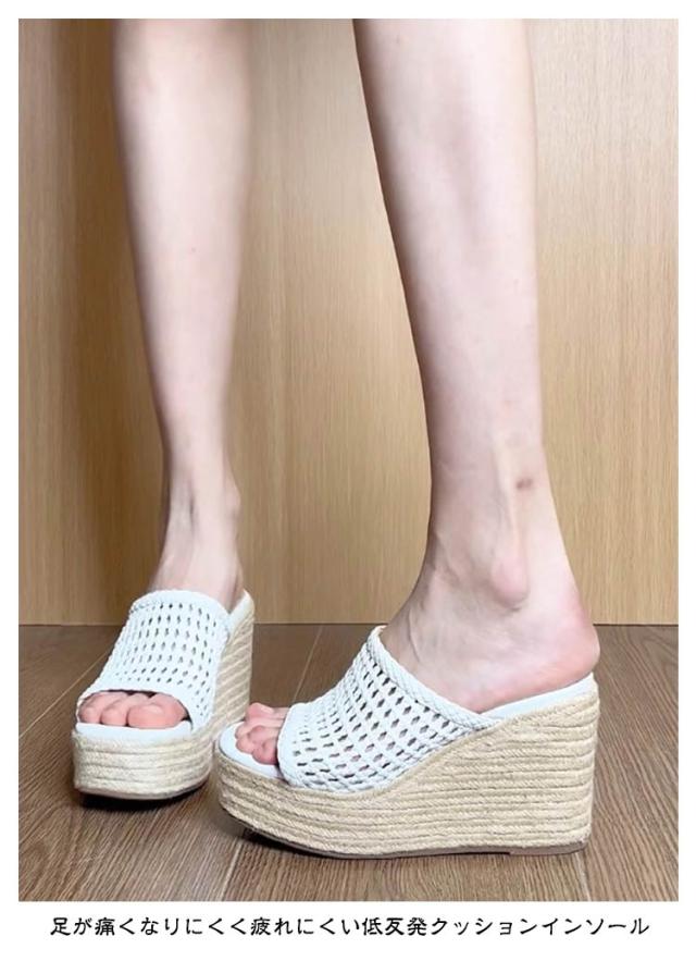 脱げにくい サンダル レディース メッシュ ミュールサンダル 7センチヒール オープントゥ 大きいサイズ ミドルヒール ウェッジヒール ホワイト 白 メッシュミュールサンダル メッシュ ウェッジヒールミュール