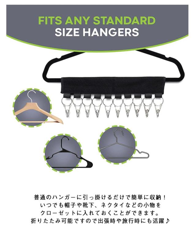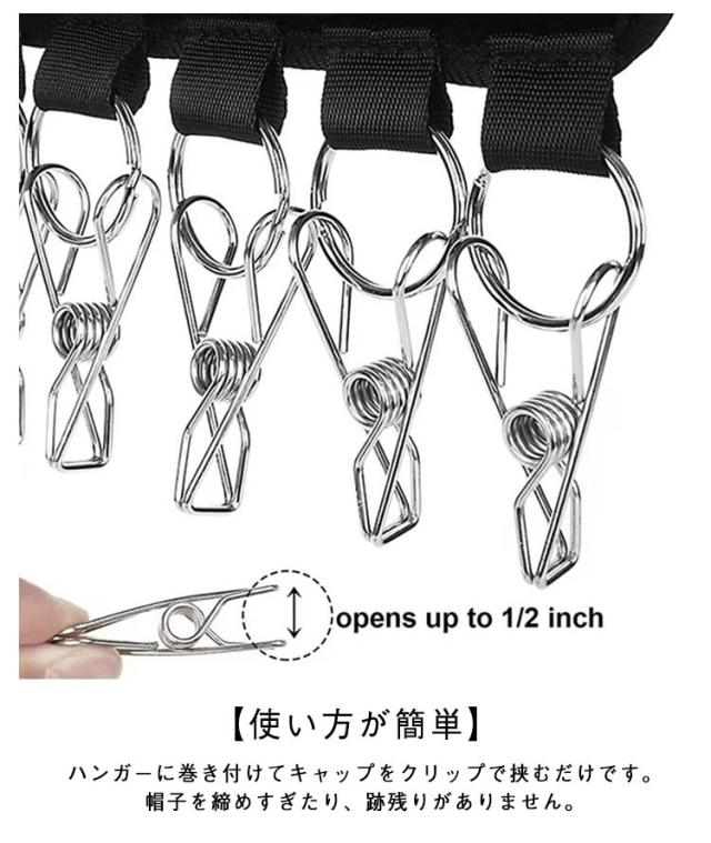 | 『室内干しのプロアイテム』 収納にも♪10連小物キャッチャー! 帽子や靴下、パンツも♪ 【商品説明】 \マジックテープ式の折り畳みハンガー/ 帽子や靴下、ネクタイなどの小物収納に♪ 収納・洗濯のアイデア商品です! 普通のハンガーに引っ掛けるだけで簡単に収納! いつでも帽子や靴下、ネクタイなどの小物を クローゼットに入れておくことができます。 折りたたみ可能ですので出張時や旅行時にも活躍♪ <お勧めポイント> 【大容量】 お気に入りの帽子の形状を失うことなく最大10個のキャップを掛けることができます。 【使い方が簡単】 ハンガーに巻き付けてキャップをクリップで挟むだけです。帽子を締めすぎたり、跡残りがありません。 【持ち運びに便利】 折りたたみ式のデザインでスペースを大幅に節約できます。スーツケースに入れて持ち運べますので、旅行や出張だどにも便利です。 【幅広い用途】 帽子だけでなく、靴下、スカーフ、ネクタイ、タオルなどにも適しています。 | |