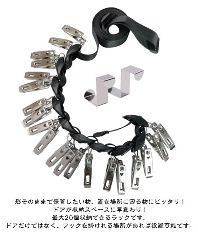 | 道具不要! 傷や跡がない! 掛けるだけ! クリップの位置も楽に調節可能! ドアハンガー クリップ20個/10個付き 形そのままで保管したい物、置き場所に困る物にピッタリ! ドアが収納スペースに早変わり! 最大20個収納できるラックです。ドアだけではなく、フックを掛けれる場所があれば設置可能です。 道具不要、フックを掛けるだけです。 インテリアのようにシンプルなデザインで収納します。 ステンレス製の丈夫なクリップ付きで、落ちる心配はありません。 バックルをスライドしてクリップの位置も楽に調節できます。 帽子だけでなく、ベルトや手袋、マフラーなどの小物も大丈夫です。 ドアに傷や跡は残さず、設置場所は自由に決められる。ひとり暮らし、賃貸の方にオススメです。 | |